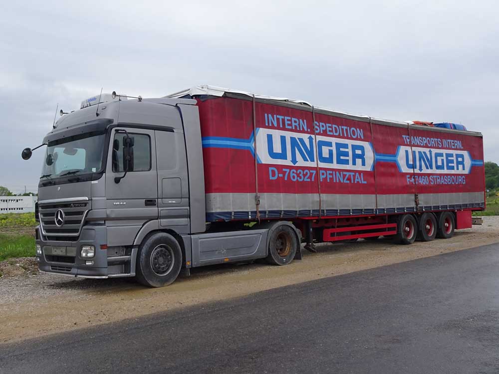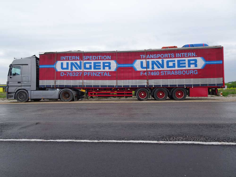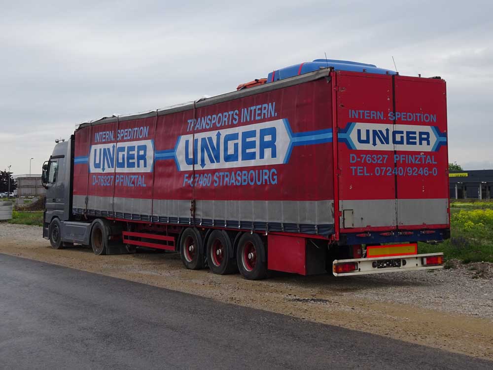 Entweder war da ein Subi unterwegs, oder der Auflieger wurde verkauft und nicht "neutralisiert". Üblicherweise sehen Unger-Zugmaschinen etwas anders aus ...
