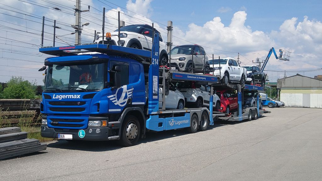 2020. Scania P410 Next Gen. Hängerzug mit Kässbohrer metago pro Fahrzeugtransportaufbau, Lagermax (AT)