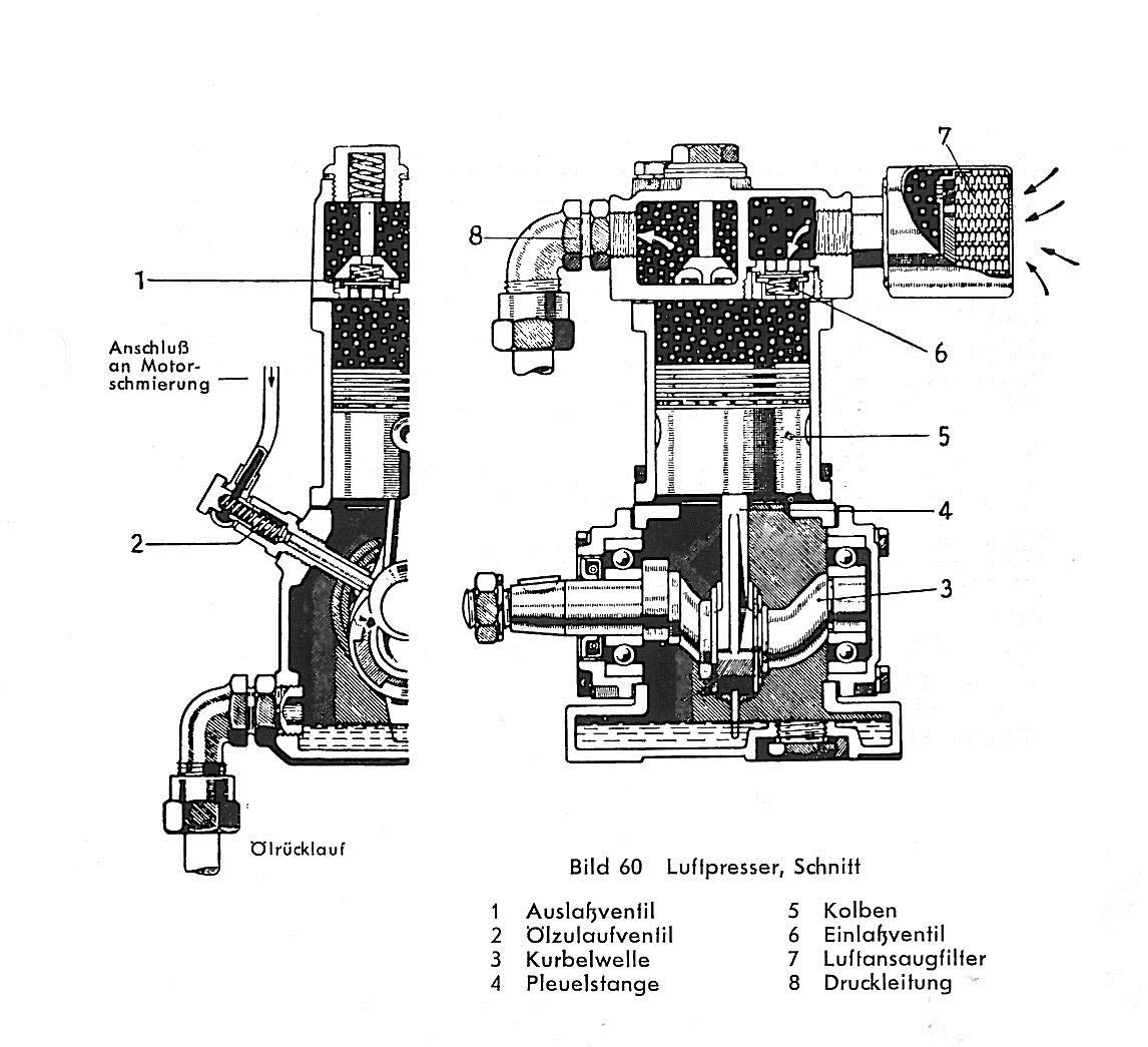 Unten ist ein Bild des Kompressors aus der Betriebsanleitung meines Büssings abgebildet. Ich zerbreche mir den Kopf darüber, welche Funktion dieses Ventil Nr. 2 hat. Der Kompressor besitzt eine Tauchschmierung, ist aber trotzdem an der Druckschmierung mit dieser Leitung angeschlossen. Hintergrund meiner Frage ist mein Problem mit dem niedrigen Öldruck meines Büssings. Hier bin ich auf der Suche nach möglichen Fehlerquellen des Öldckverlustes, bevor ich die Lagerung des Motors angehe. Wäre ja ärgerlich, wenn sich beim Zerlegen plötzlich herausstellen würde, dass die Lager in Ordnung sind, aber irgend ein Ventil für den mangelhaften Öldruck verantwortlich ist.