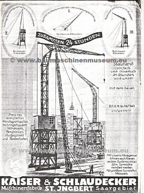 In einer Veröffentlichung aus der damaligen Zeit heißt es "Der erste KAISER-Turmdrehkran mit verstellbarem Biegebalkenausleger für Ausladungen von 12 und 5 m und Traglasten von 800 bzw. 3.000 kg - Rollenhöhe 21 bzw. 30 m."