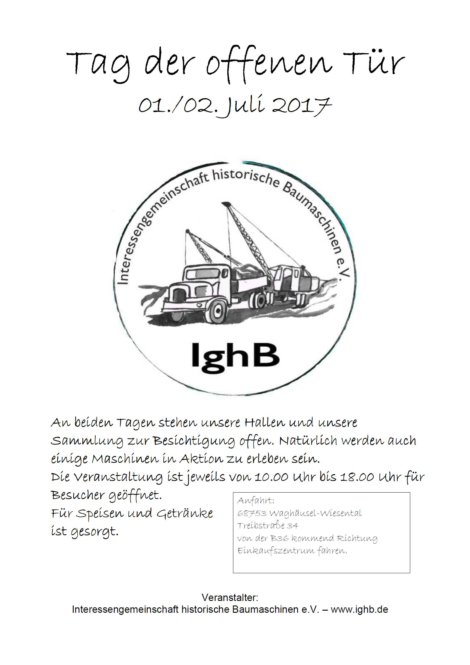 nachdem wir in diesem Jahr keine historische Baustelle veranstalten wird es einen Tag der offenen Tür an unseren Hallen geben. Termin ist der 01./02. Juli 2017. Selbstverständlich wird es auch Maschinenvorführungen geben, soweit es unser Hof zulässt. Für Besucher-Lkw haben wir begrenzten Platz auf einer angrenzenden Wiese.