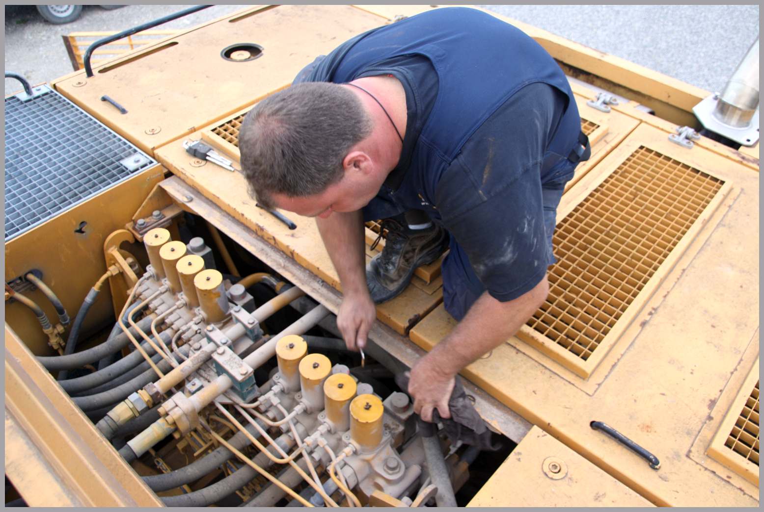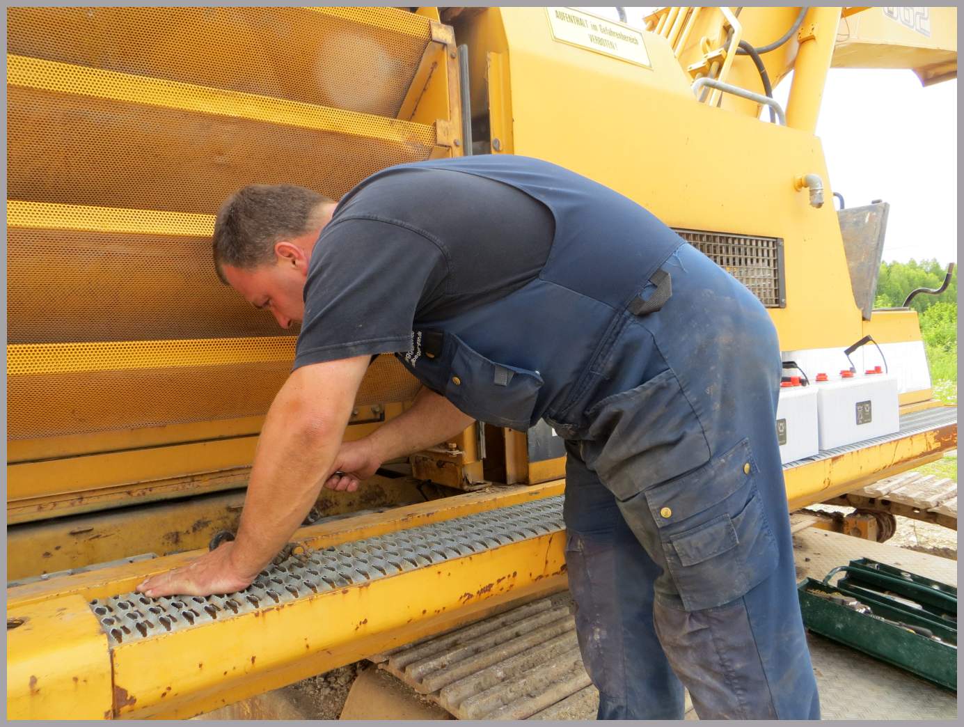 Als nächstes stand dann die Demontage des Abbruchgitters auf dem Programm... da der Andi ein "Scheibe - Offen" Baggerfahrer ist und der Bagger auch nicht mehr im Abbruch laufen wird, war klar, dass der Affenkäfig nicht länger zum Schutz des Fahrerhauses benötigt wird.... Weg damit! 46er Schlüssel und Schrauberln auf.... dann machte es "klock" und das Gitter lag auf dem Dach.... runterschmeissen gestaltete sich dann doch schwieriger als erwartet, da das auf den ersten Blick recht filigran wirkende Gitter doch gut Gewicht hatte.... Nunja... mit vereinten Kräften schmissen wir das Gitter dann nach vorn runter und Andi konnte einen ersten, nicht durch die Scheibe getrübten Blick, aus dem Führerhaus werfen...