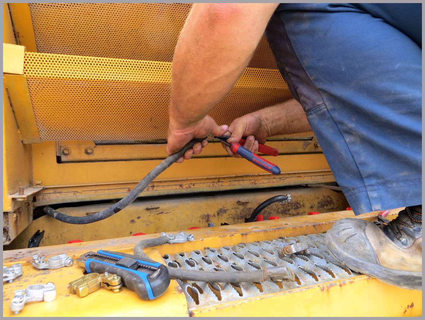Nachdem die Schaufel ordentlich gesichert war, wurde damit begonnen dem Bagger 2 neue Batterien zu spendieren... Nach der langen Zeit sicherlich keine schlechte Idee... Im selben Zuge erneuerten wir dann auch gleich die Batterie - Polklemmen, da die alten natürlich auch schon recht angefressen waren.