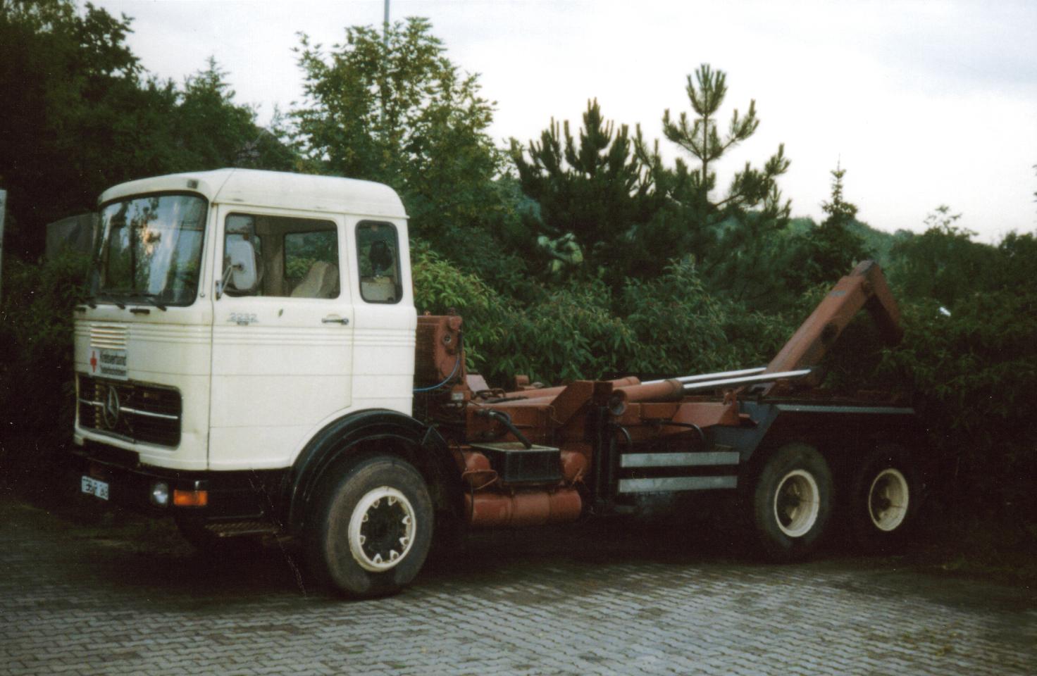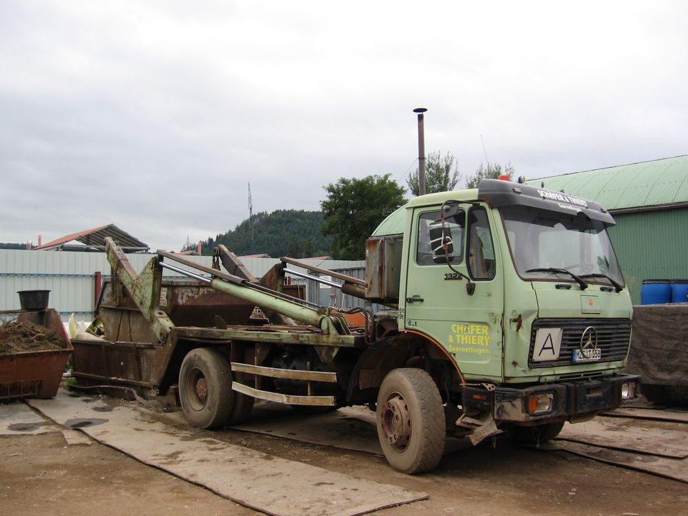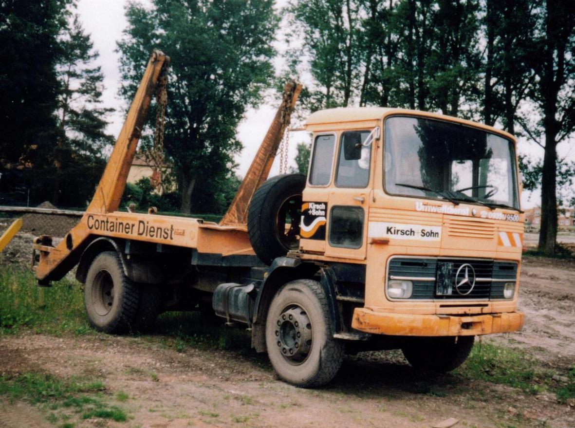 Mercedes-Benz LP 2232 L Hakenabroller am frühen Morgen in Tauber-Bischofsheim.