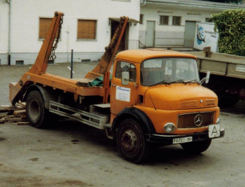 Dieser Absetzkipper ist auf einen mittelschweren Mercedes-Benz LP aufgebaut dessen Schwingtüren durch Schiebetüren ersetzt wurden.Diese "Türumbauten" sah man früher oft bei Nutzfahrzeugen deren Einsatzgebiet die engen Strassen von Großstädten sind.