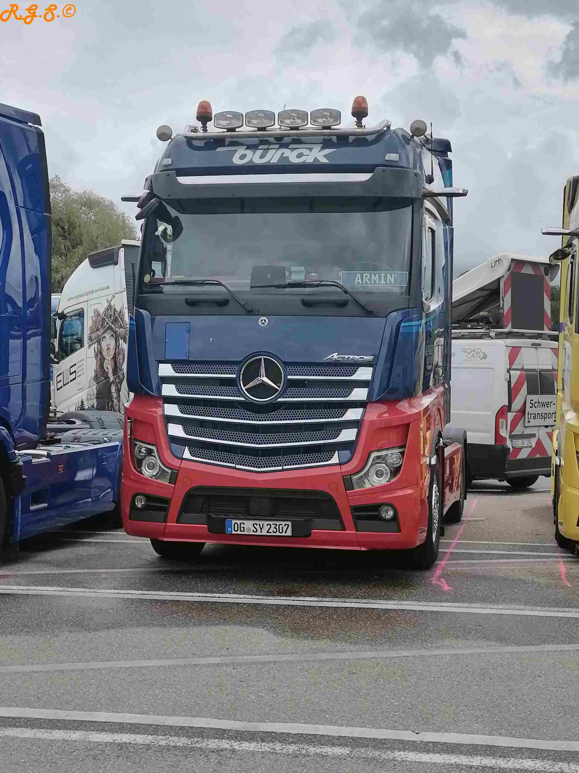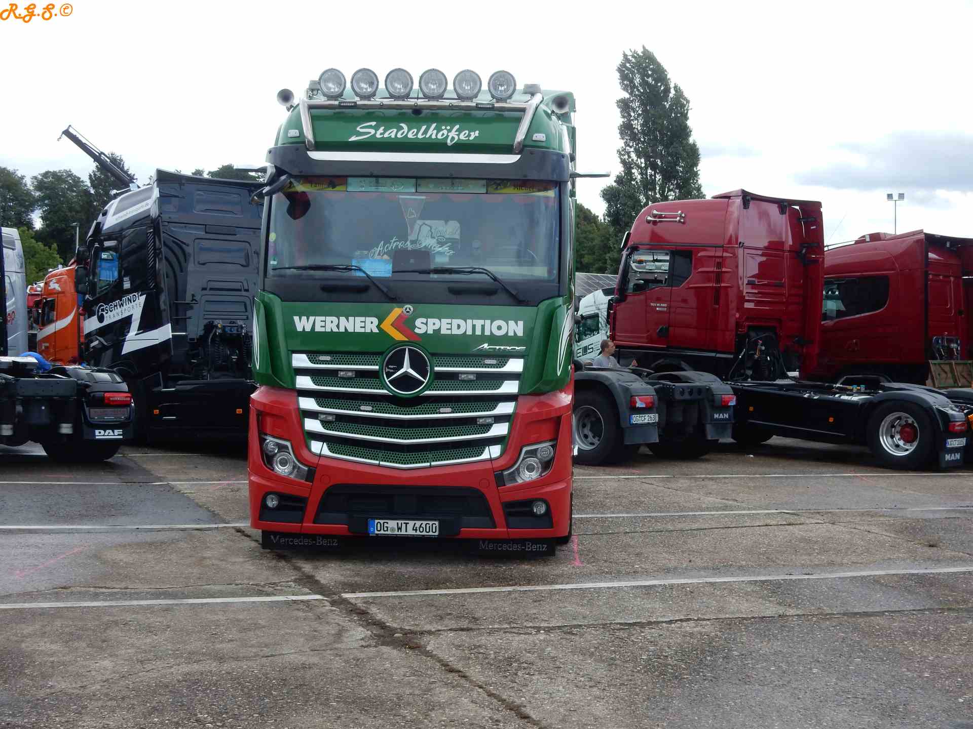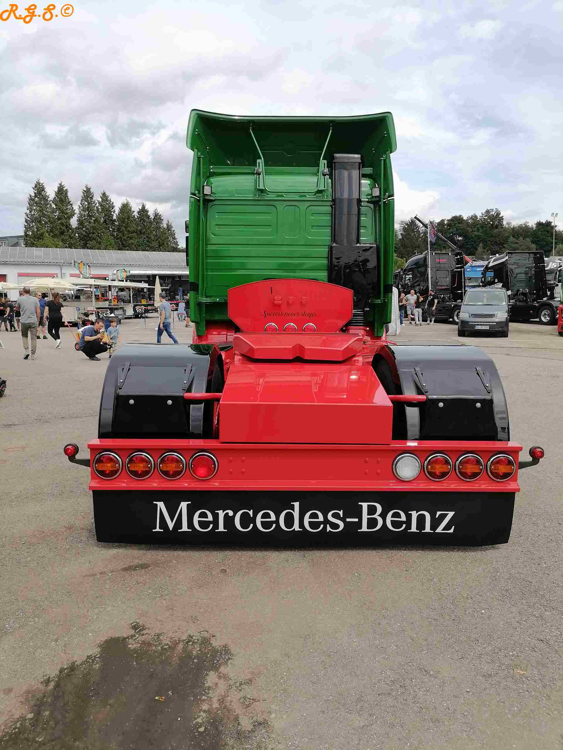 tolle Bilder! klatsch Ich bin dann am Sonntagmorgen vor Ort gewesen! zwinker Für mich interessant was sich doch da im Vergleich zu meinen Bildern wieder alles verändert hat! Als ich zwischen 9 Uhr und halb 10 ankam fuhren die 2 Eichelbergers gerade ab! Der DAF vom Weinmann Aach war schon nicht mehr da... genauso wie der F90 neben Joachims 143. Auch hatten sich schon Lücken gebildet zwischen den Show Trucks... 2 weitere LKWs haben sich zum Actros vom Werner gesellt... zwinker usw... Bilder stelle ich dann auch noch ein...