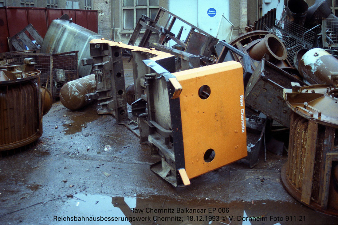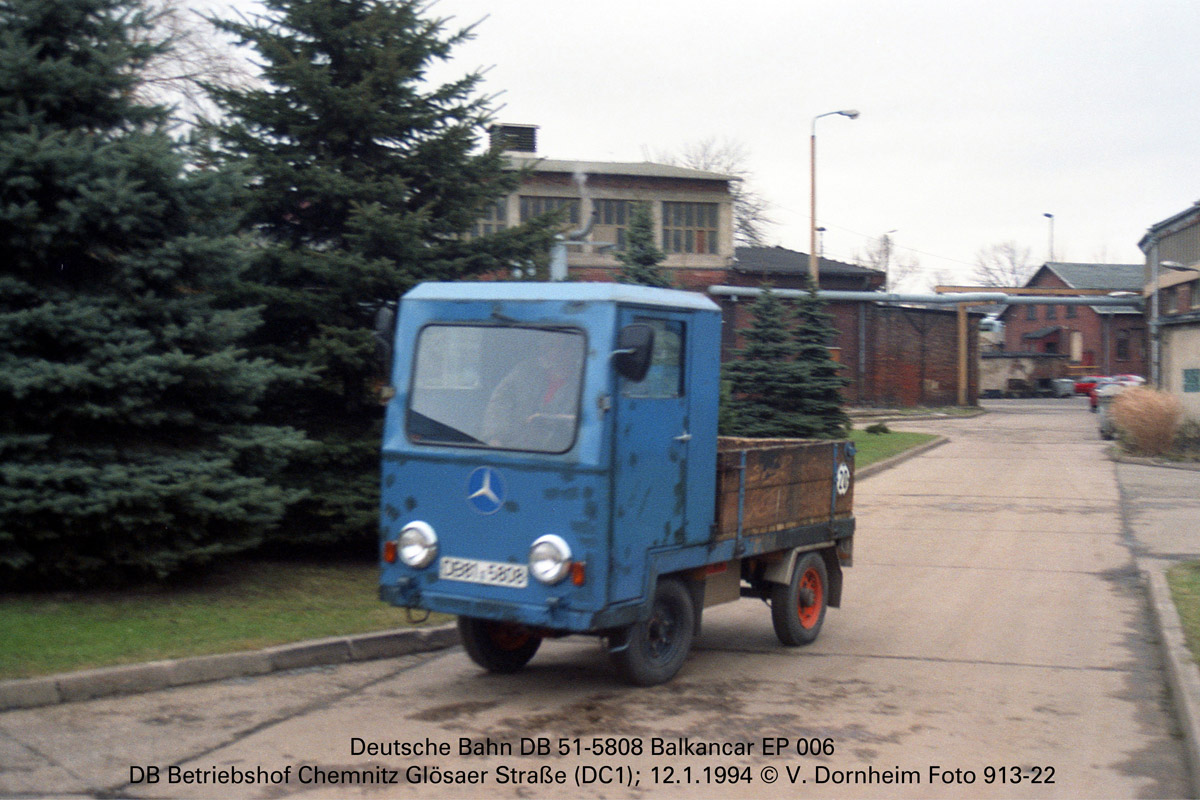 DB 81-5808 Balkancar EP-06 mit Führerhaus für den “Fernverkehr” zwischen den Betriebsteilen am 12.1.1994 im DB Betriebshof Chemnitz Betriebsteil Glösaer Straße (DC1).