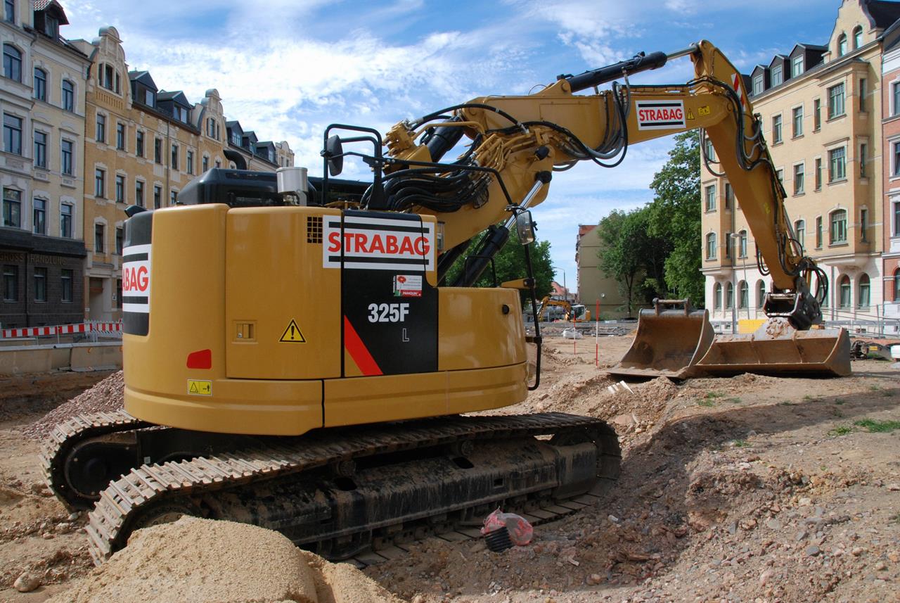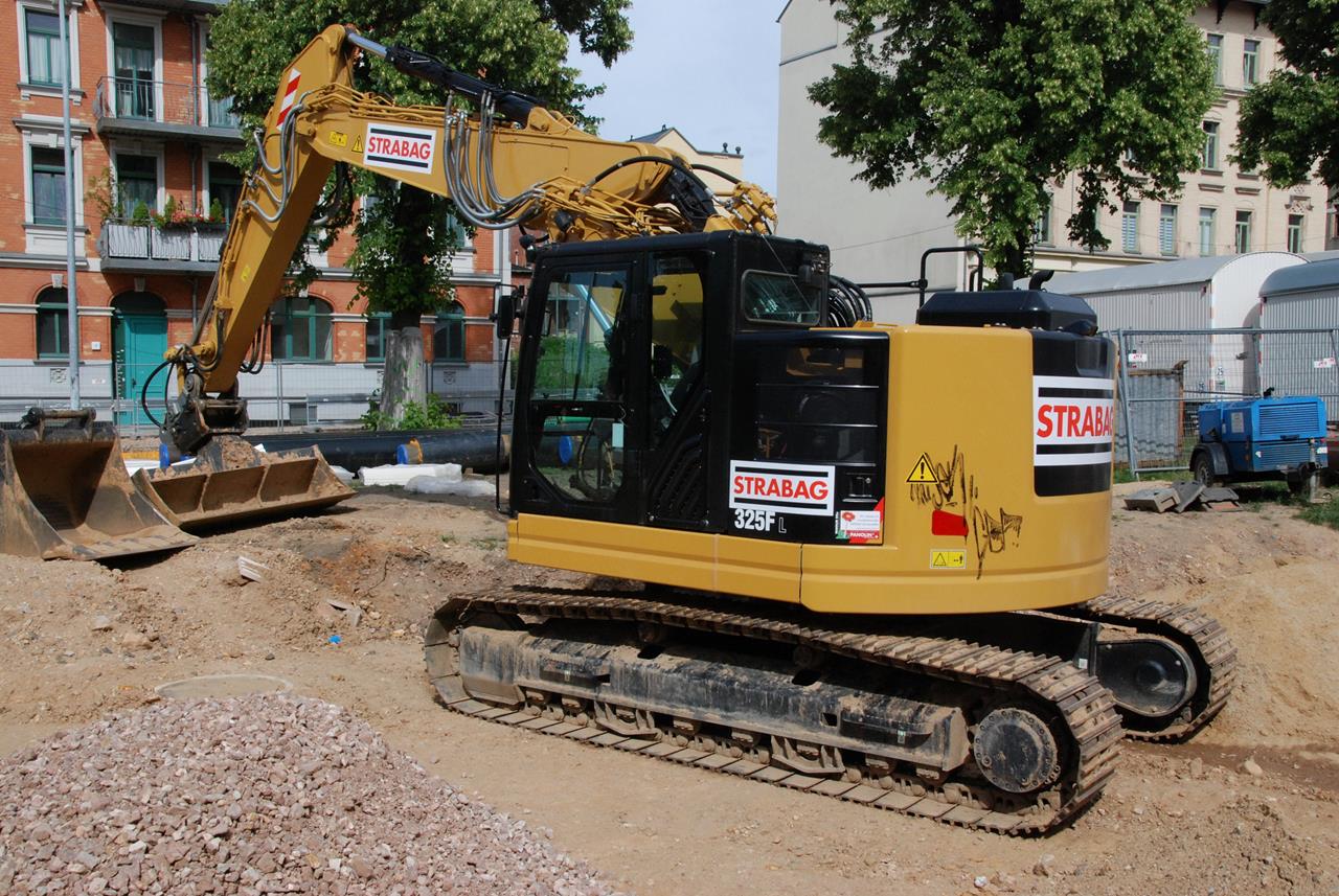 Den neuen Bagger 325F LCR, der leider schon durch Vandalen beschmiert wurde, setzt die STRABAG beim Kanalbau ein. Ein rundum optisch gelungener Bagger.