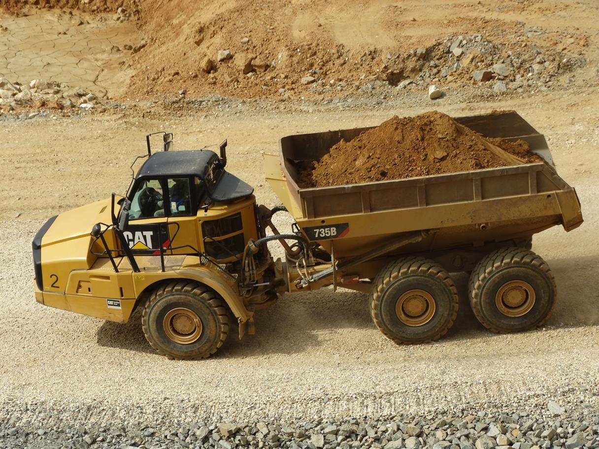 Caterpillar 735B mit Muldenerhöhung im Steinbrucheinsatz beim Abraum fahren.