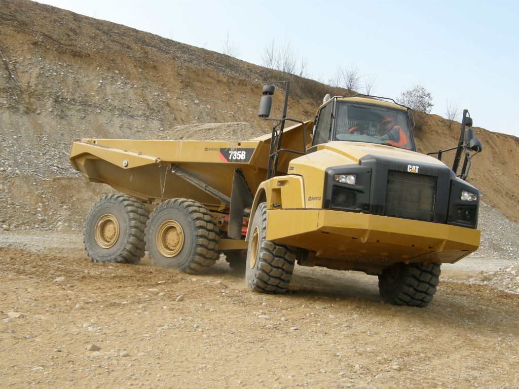Der neue CAT 735B auf Probefahrt, man beachte den Fahrer, so einfach ist es den Cat 735B zu fahren.
