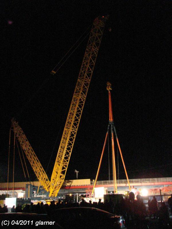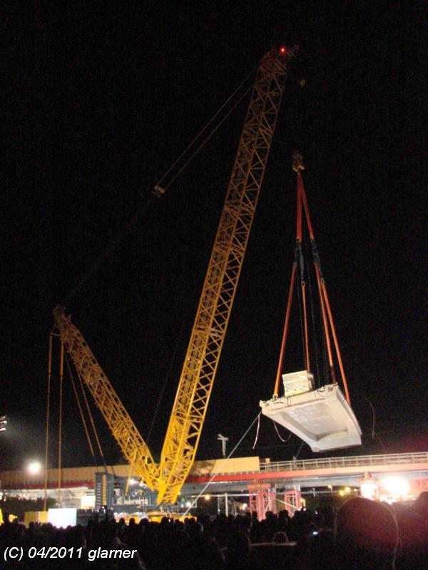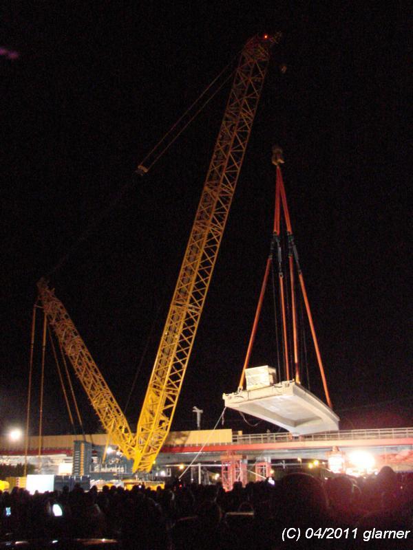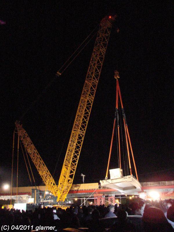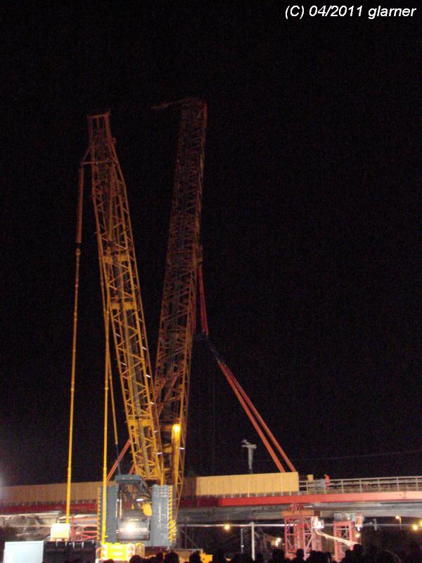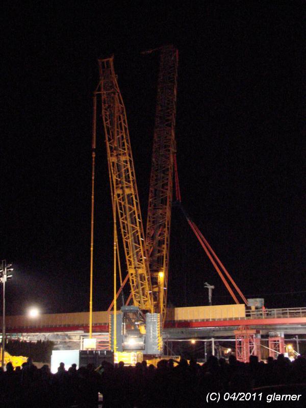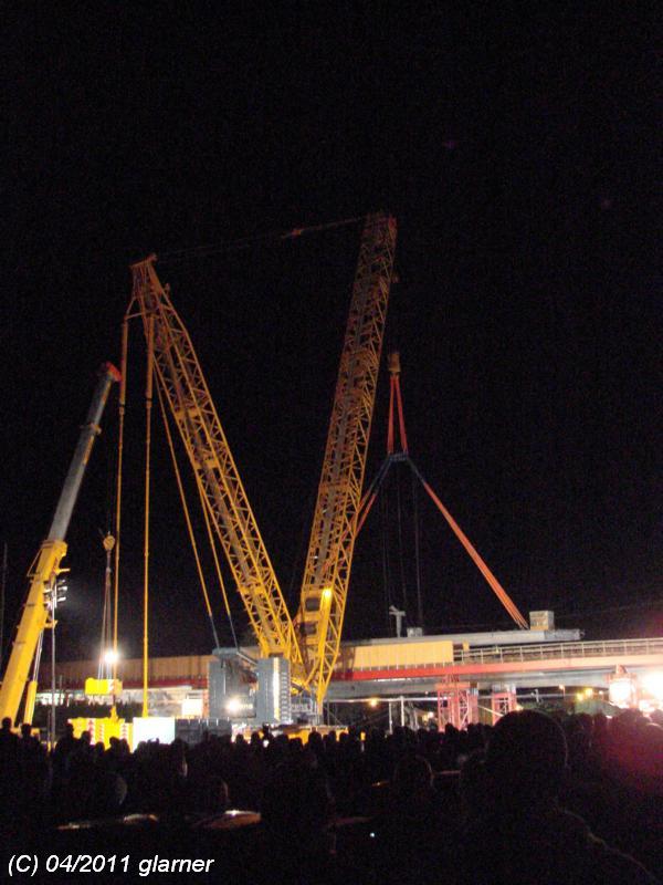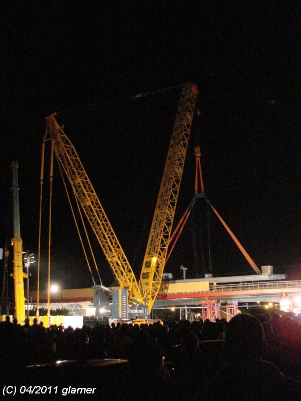 Hier noch Bilder - der richtigen Reihenfolge halber aufgeteilt in drei Beiträge - vom Einheben des Brückenmittelteils mit einem Gewicht von ca. 420 Tonnen