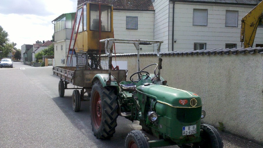 Eine ebay-Auktion mit eben diesem Schaeff hat mich nun auf die Idee gebracht, mir einen kleinen Bagger für Ladetätigkeiten und zum "Spielen" auf den Hof zu stellen. Er war dementsprechend günstig und so habe ich ihn blind gekauft. Wir sind dann mit dem Tieflader zum Standort nahe Rosenheim gefahren. Die Straßen zu dem Einödhof waren dermaßen eng, daß wir schon Angst hatten, nicht mehr in die Zivilisation zu kommen. Ermutigt durch den Verkäufer, der uns immer wieder am Telefon erklärte, daß die vorige Woche schon ein Sattelzug vorbeigefahren ist, wagten wir uns vorwärts. Die letzte Stichstraße zum Hof dann rückwärts. Dort angekommen, erfuhren wir, daß der Sattelzug eine Lenkachse besaß