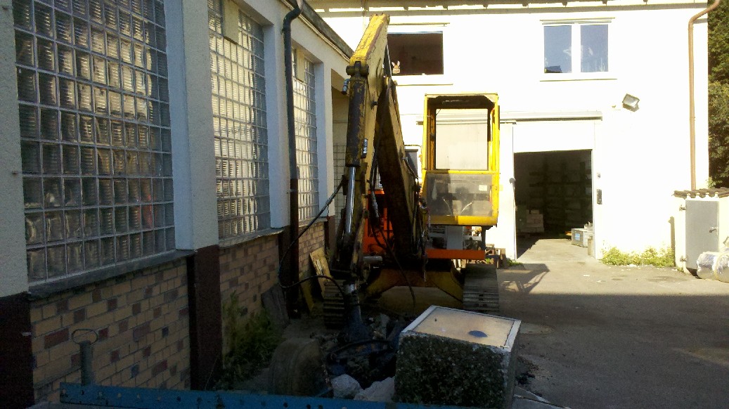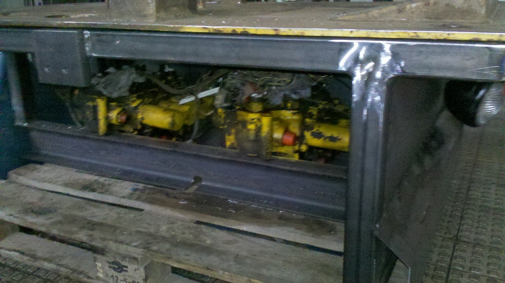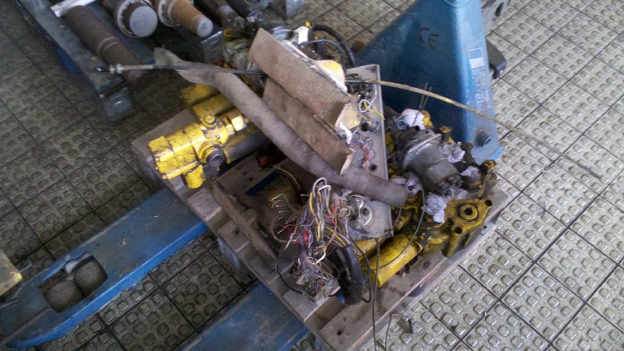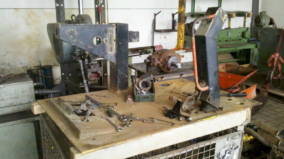 Nach einigen Arbeiten ist nun der rechte Fahrantrieb abgerissen (siehe Bild) - kein Wunder bei den schon fast künstlerischen Schweißnähten einer vorhergegangen Reparatur. Also, alle alten Schweißnähte abschleifen, alles verbogene mit Hydraulikhebern ausrichten, Fahrantrieb anheften - ausrichten und fertig schweißen. Zum Schluß noch neue Hydraulikschläuche drauf, die Schwenkverschraubungen natürlich vorher prüfen und nachziehen, und gut ist!