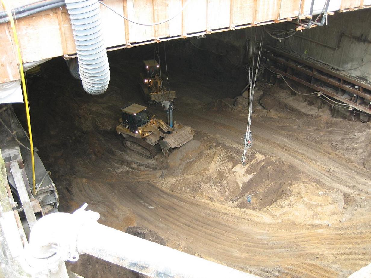 Das breite Fahrwerk dient auch dazu dem Bagger genügend Stabilität zu geben, auf den folgenden Bildern sieht man wie tief er den Auslegen senken muss um das Material zu fördern.