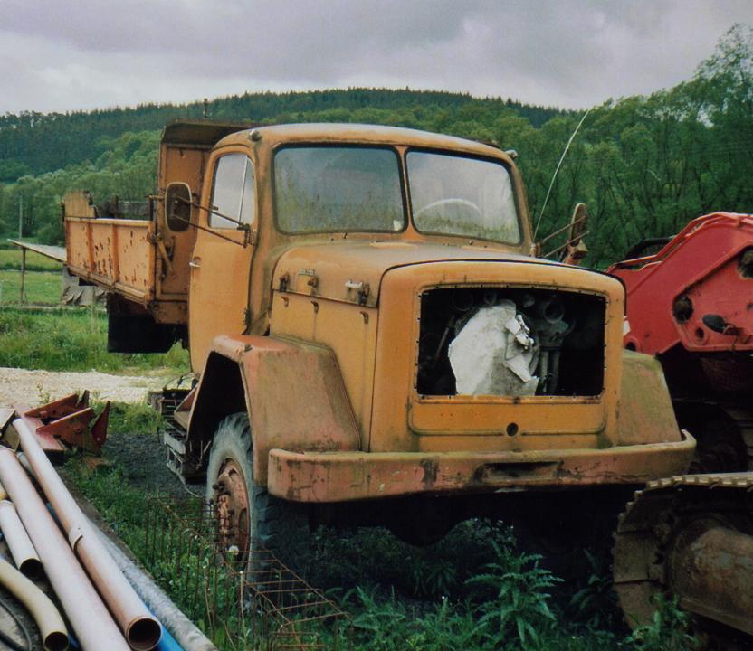 Ein ähnlich heruntergekommenes Fahrzeug entdeckte ich im Jahr 2000 in Wackersdorf.Bei diesem Magirus stammen nur Fahrgestell und Führerhaus von Magirus.Der Rest von einem mir unbekannten Fahrzeugbauer!