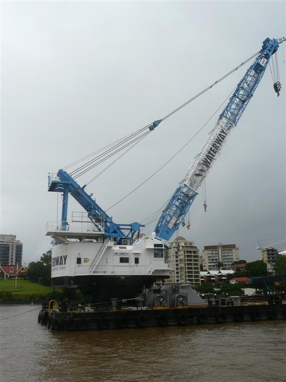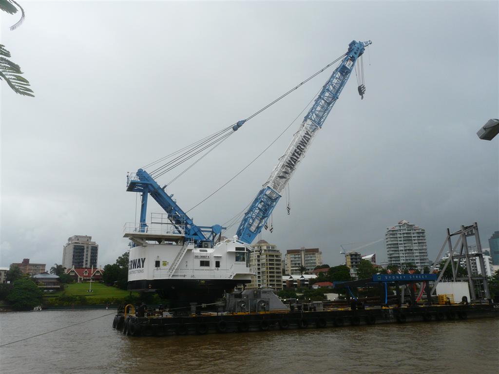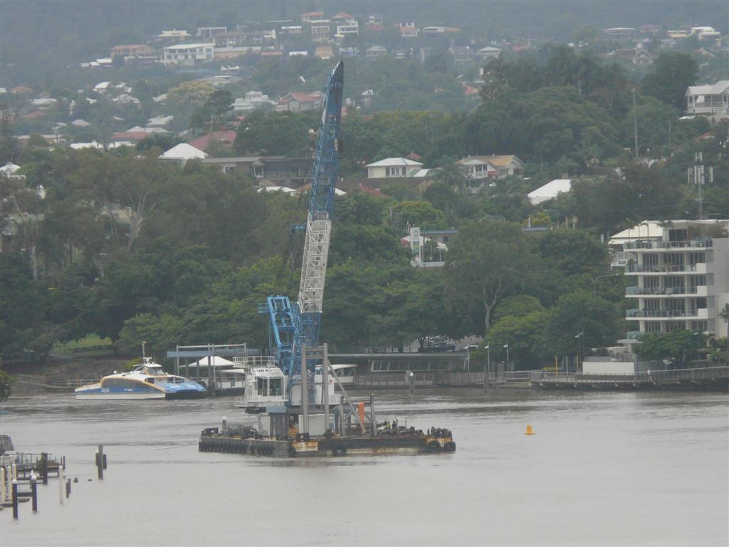 Dieser hier ist dabei Hochwasserschaeden in Brisbane zu beseitigen. Wiederaufbau der zerstoerten Faehranleger