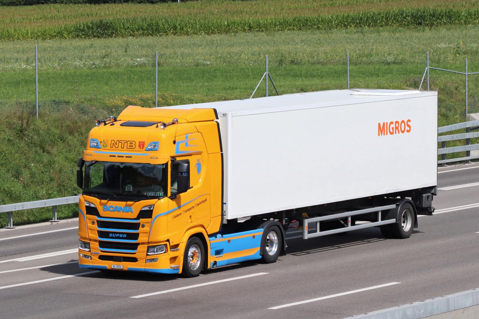 Vermutlich transportieren sie Produkte der Bischofszell Nahrungsmittel AG (Migros-Tochterfirma), denn die Migros Supermärkte werden ja von eigenen Fahrzeugen beliefert.
