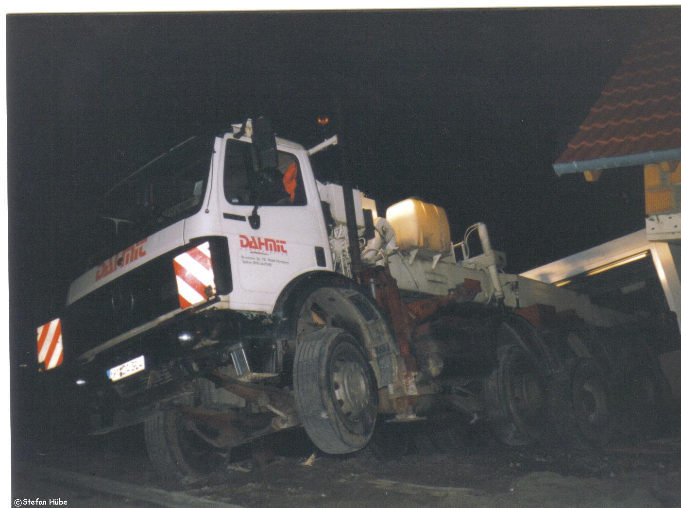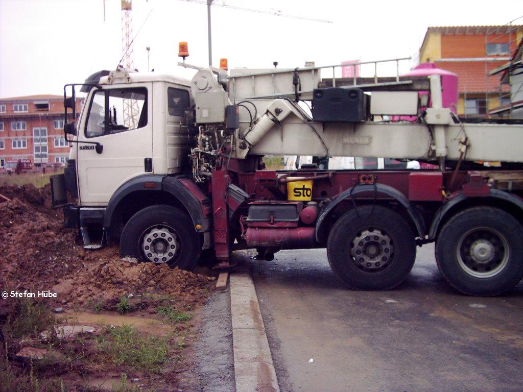 ,gab mit einem mal die gesamte Erde unter der Abstützplatte nach.Es drückte das Erdreich nicht wie normalerweise hinter und vor der Platte nach oben , sondern in einer tiefe von ca. 1m zur Seite rauß.Der LKW kippte also über die hintere rechte Seite ab.Mir blieb fast das Herz stehen