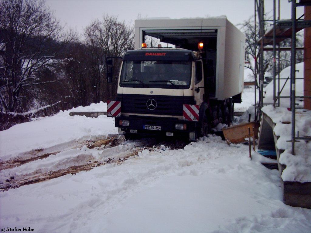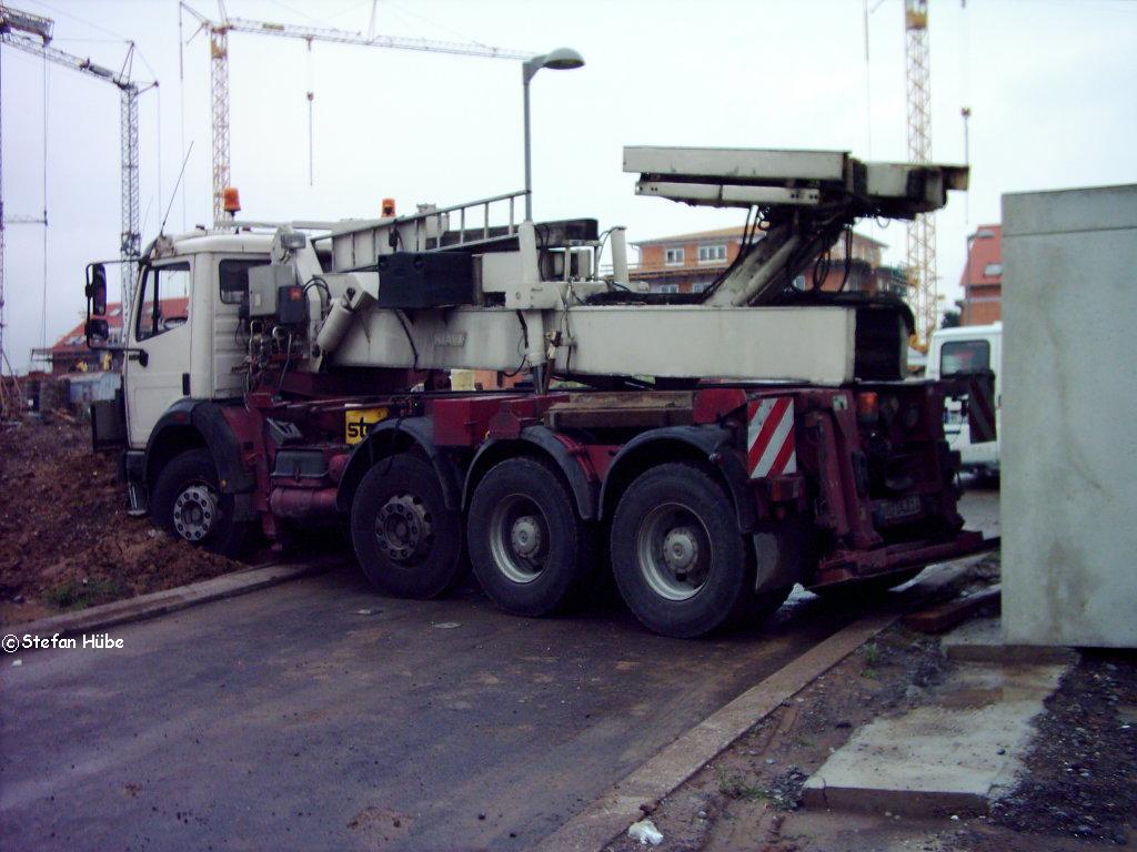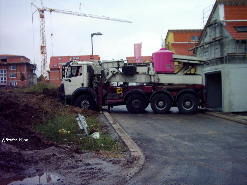 um die GA auf'n Boden zu setzten und damit den LKW zu stabilisieren.Hat Gottseidank auch funktioniert.Nun erst mal ne 1/2 Schachtel geraucht und die Lage gepeilt : heißt-Autokran rufen(120To weil 20m Ausladung )- Warten.......3 Std. Endlich .GA anhängen und mit Kran halten.Tragegestell aus GA rausfahren dann nach vielem Schaufeln und noch mehr Hölzerschleppen LKW aus'm Dreck fahren.Jetzt flugs noch die GA aufstellen und schon konnte ich um 22:30 meine 3 Stündige Heimreise antreten.PUUUUH was'n Tag