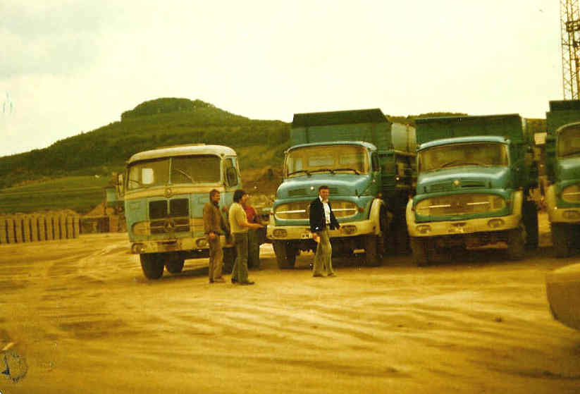 ein altes Foto aus meinem Archiv. Es zeigt den aktiven Fuhrpark der Fa. Jakob Stockschläder aus Ochtendung in den siebziger Jahren. Neben einem MB LP 333 für losen Zementtransport etliche MB LAK 2624/2623 und LAK/LK 1624, 1620, 334 sowie einige LP 1632 und Büssing BS 16 L. Während die Kipper vor allem den Bims aus den Abbaugruben zum Bimswerk transportierten, brachten die Planenzüge häufig Zement in Säcken aus Erwitte nach Ochtendung. Weitere alte Fahrzeuge dieser Firma noch auf Dias vorhanden.