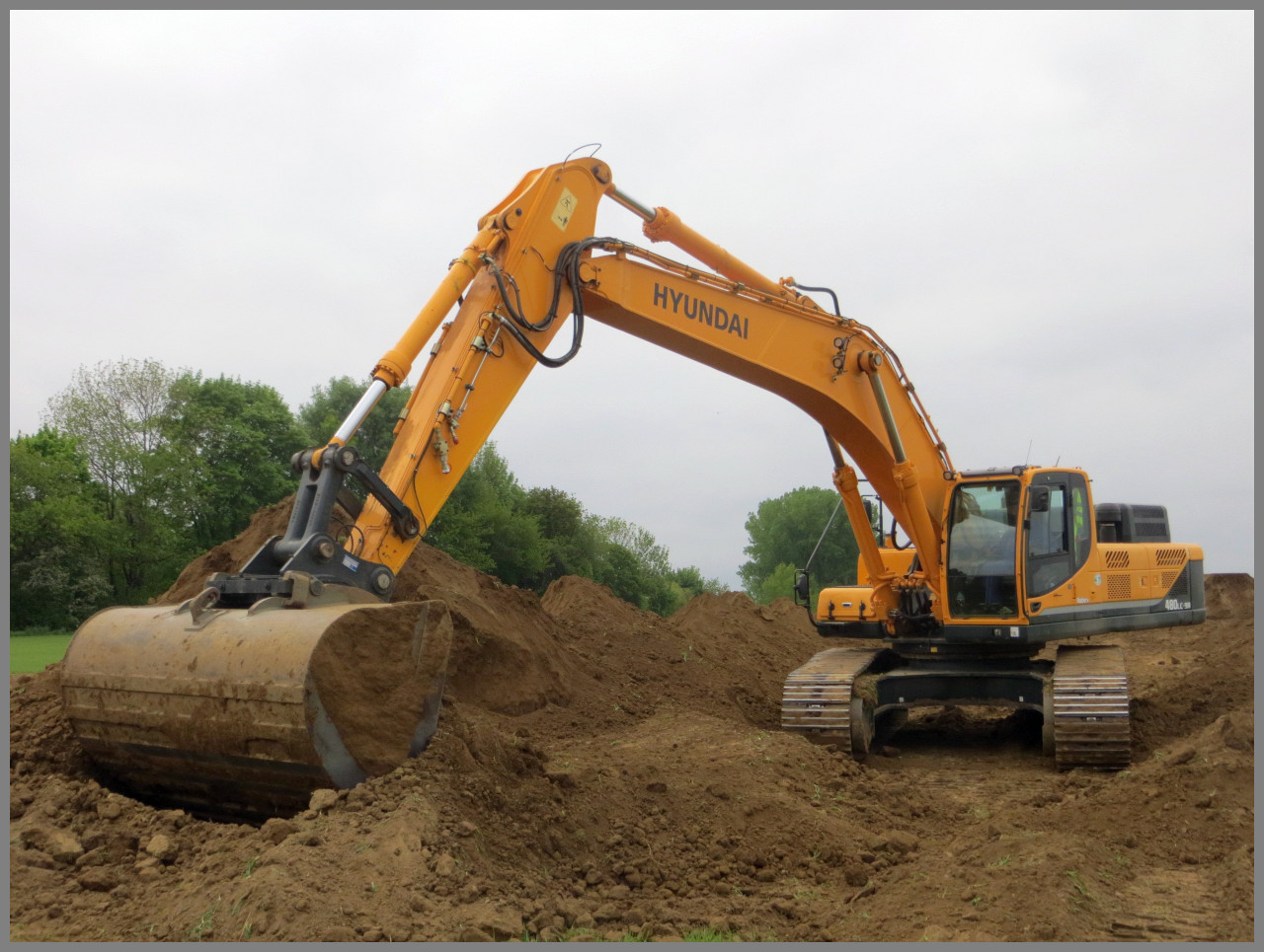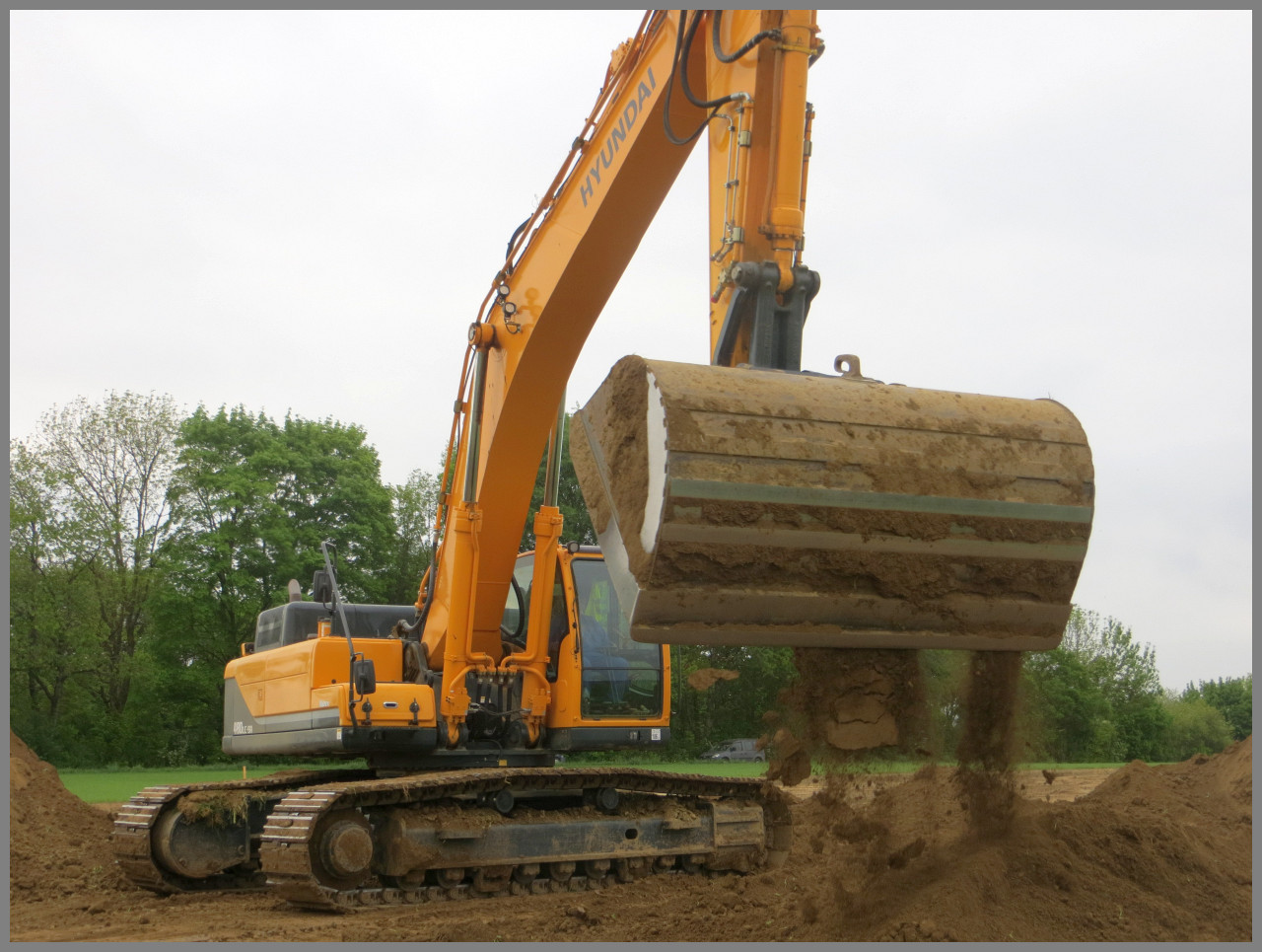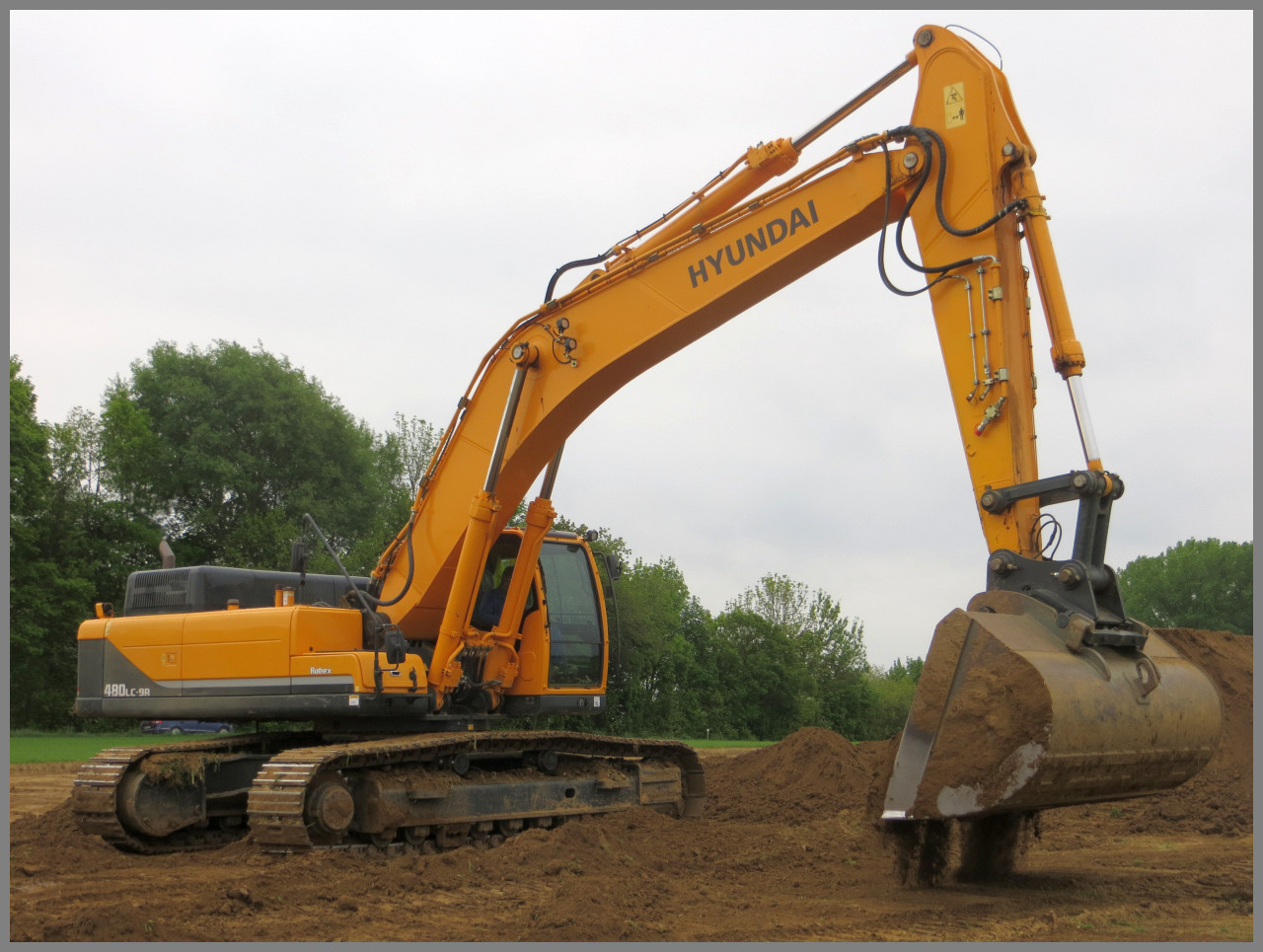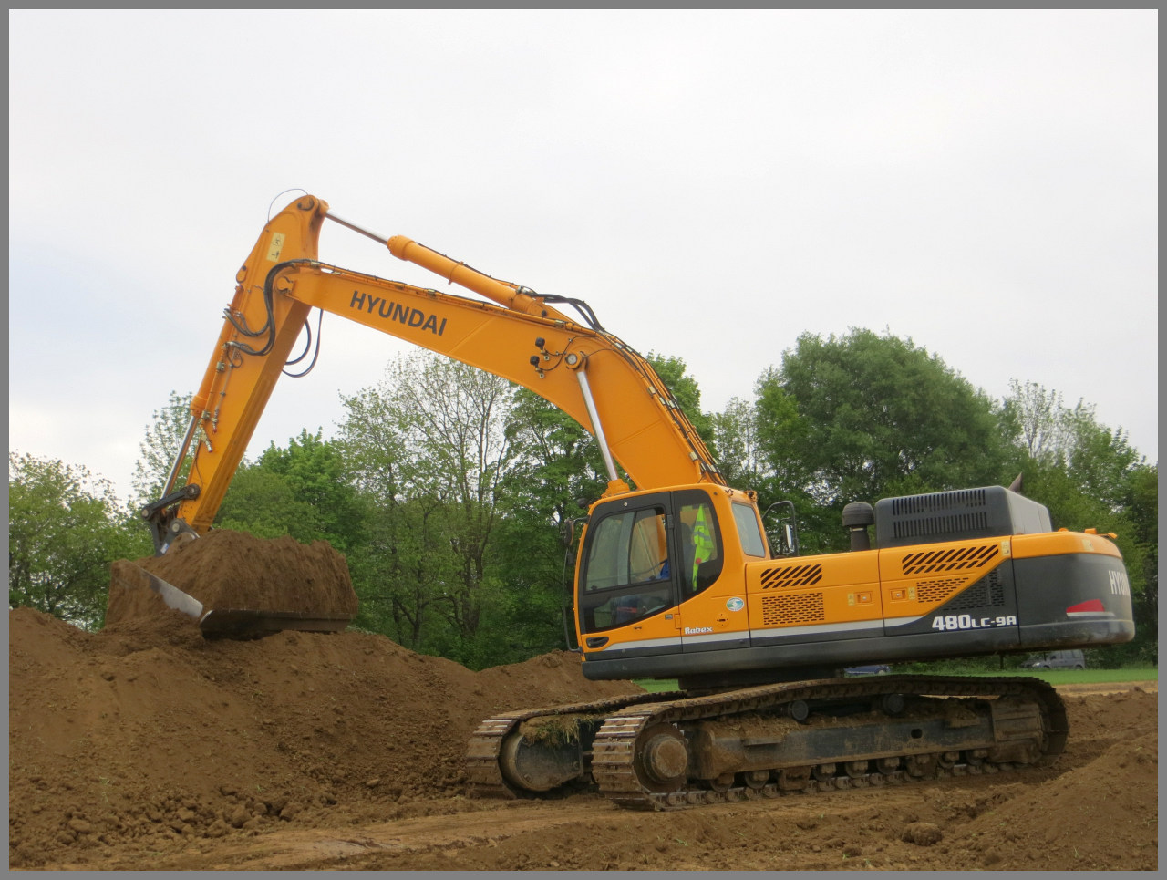 Den Terramix Hyundai habe ich erst gestern auf einem Tieflader inkl. BF3 in voller Fahrt auf der A92 gesichtet... heute in der früh habe ich dafür diesen Hyundai 480 LC-9A mit starrem Humuslöffel im Einsatz sehen können! daumen