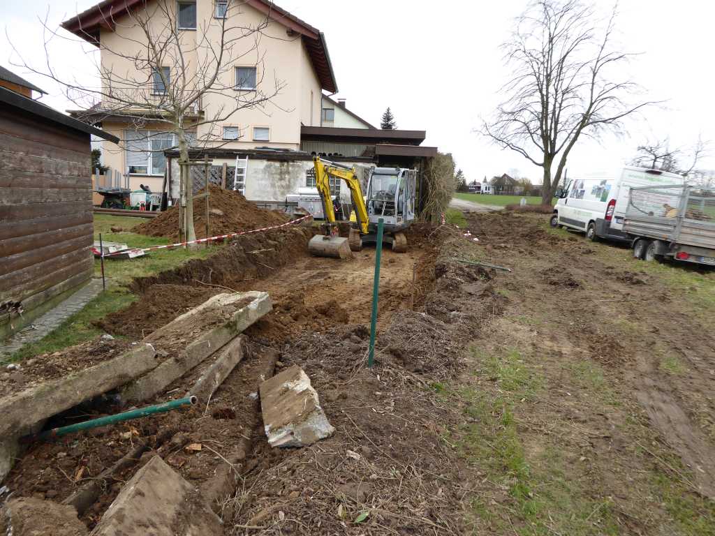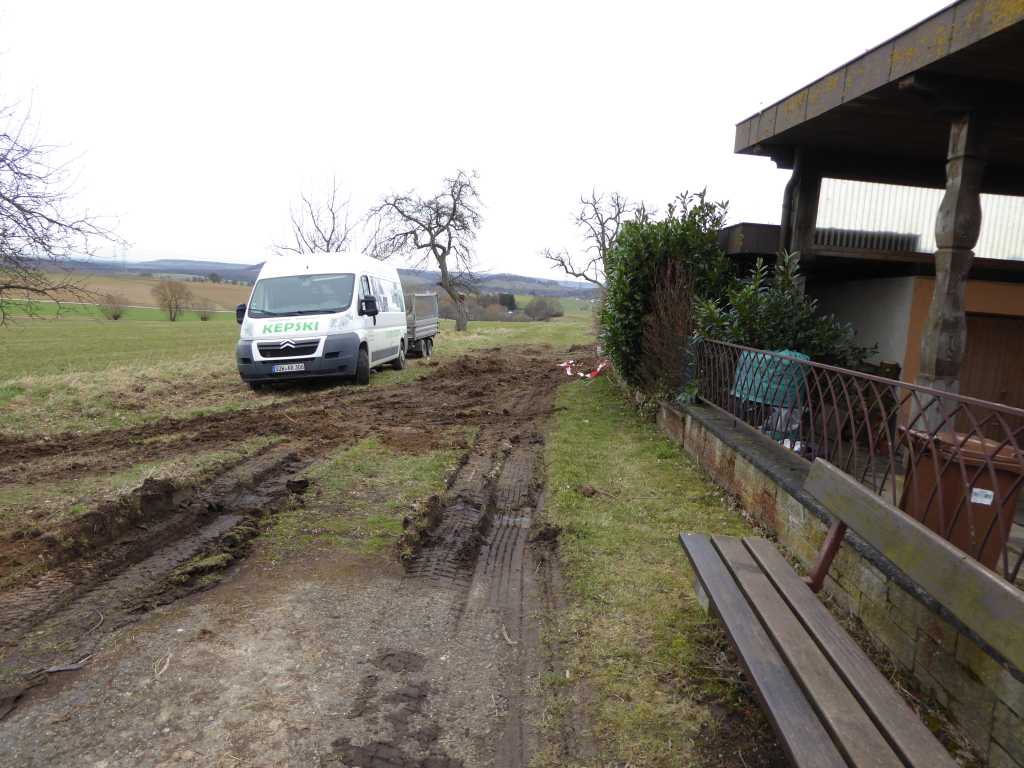 Eigentlich hatte ich auch gehofft, dass der Stellplatz bis dahin fertig sei, ist er vermutlich auch, aber ob ich den kleinen Feldweg befahren kann, halte ich im Moment für fraglich, den hat der GaLabauer mit seinem MAN Kipper und den fast abgefahrenen Reifen ziemlich ruiniert.
