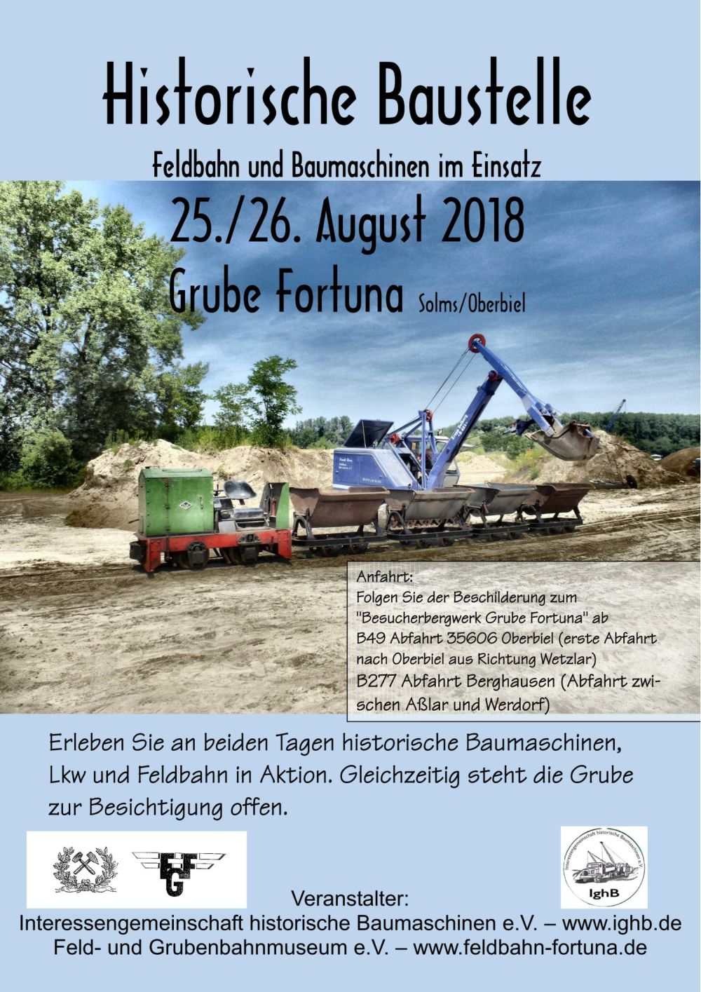 n diesem Jahr beschreitet die IghB neue Wege mit iherer historischen Baustelle. Zum ersten mal bewegen wir uns weiter weg vom Standort Waghäusel bis nach Solms-Oberbiel bei Wetzlar. Da unsere Mitglieder aus dem ganzen Bundesgebiet kommen dürfte das auch weniger ein Problem sein. Unsere historische Baustelle veranstalten wir gemeinsam mit der "Feldbahn Grube Fortuna" auf deren Gelände. Dort ist eine ca. 2,5km lange Feldbahnstrecke aufgebaut mit viel Rangiermöglichkeiten. Die Ausstellungshallen der FGF bieten noch eine zusätzliche Attraktion. Selbstverständlich sind auch Kipper-Lkw unterwegs für die Ladespiele unserer Baumaschinen. Als besonderes Highlight versuchen wir den Weserhütte-Schaufelradbagger vor Ort in Betrieb zu nehmen.