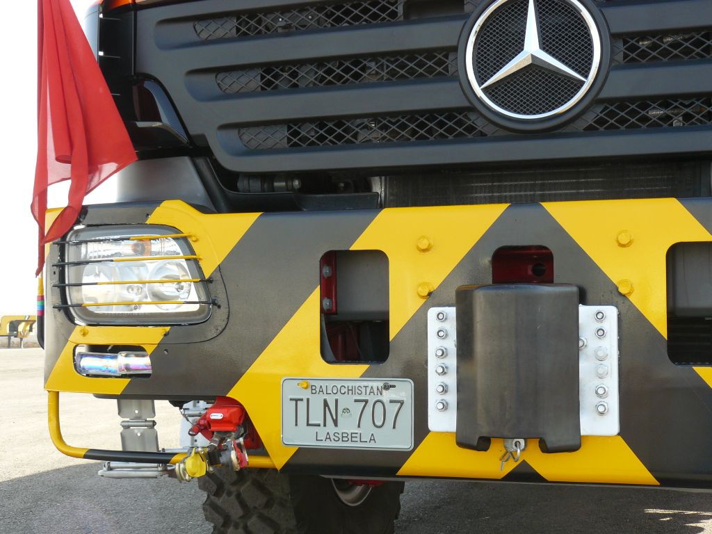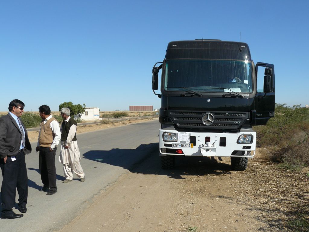 Natuerlich noch eine zweite Zugmaschine davor setzen und mit vereinten Kraeften druecken. Dummerweise hat aber Pakistan die Schubstange wohl noch nicht erfunden, jedenfalls konnten wir weit und breit trotz aller unserer Bemuehungen keine auftreiben.