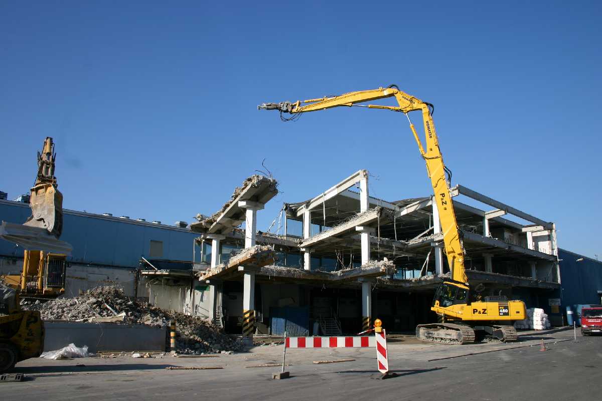 Kurt Eberle AG aus Freidorf (Schweiz) mit PC 450 LC-6 Longfront beim Abbruch eines alten Getreidesilos.