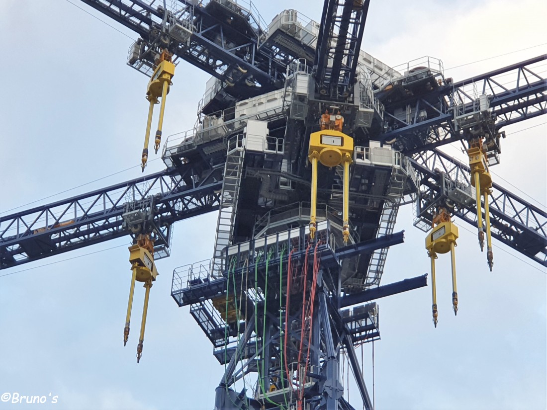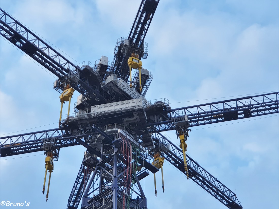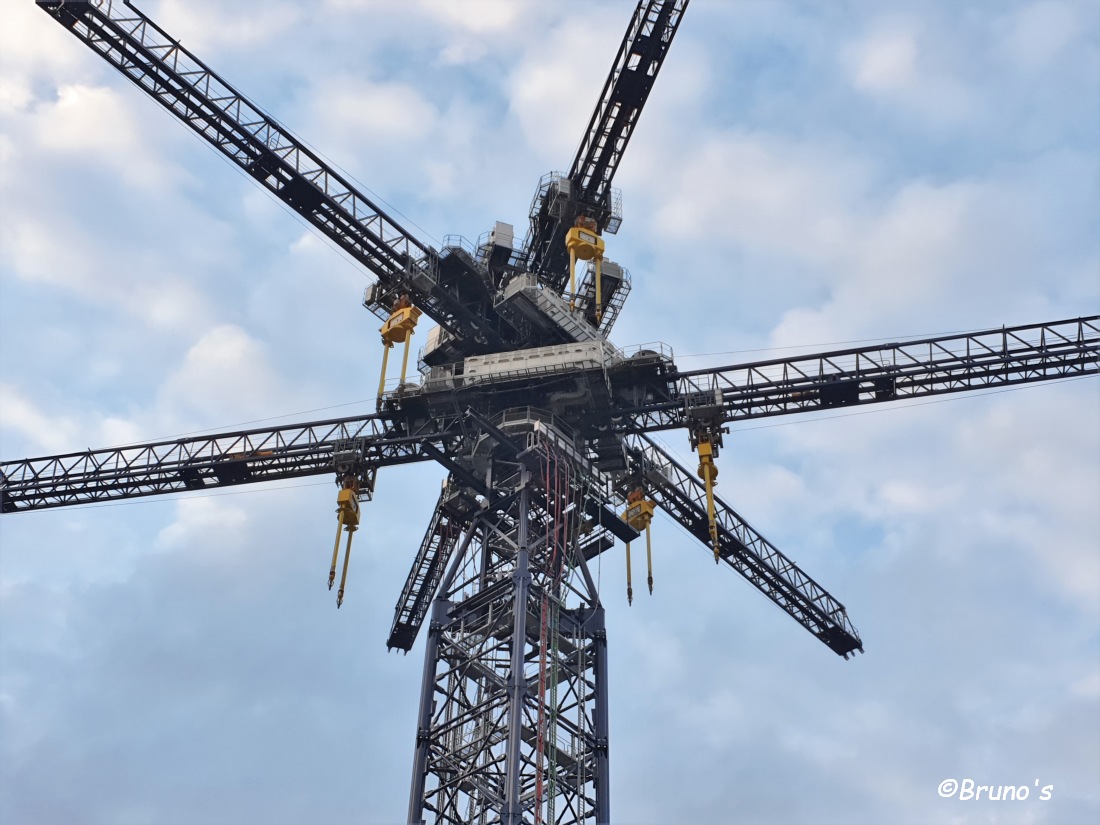 Die beiden Ausleger gehören zusammen, das ist ein Stück. Sie heben und senken immer gemeinsam. Die Betonklötze haben doch ca 30 Tonnen, so braucht es auch kein Gegengewicht. Wenn der Kran läuft, dann läuft er 24/365. Das Ganze läuft voll automatisch.
