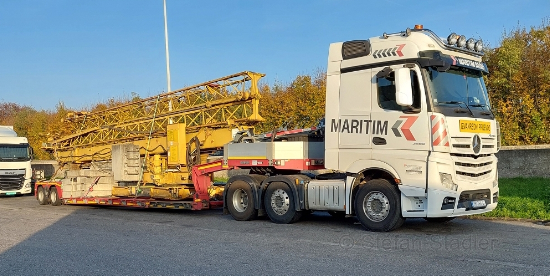 2558 als 6x2/4 mit zweiachsigem Tiefbett beladen mit einem gebrauchten Hochkran in Fahrtrichtung Heimat