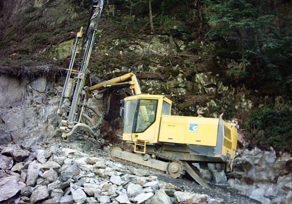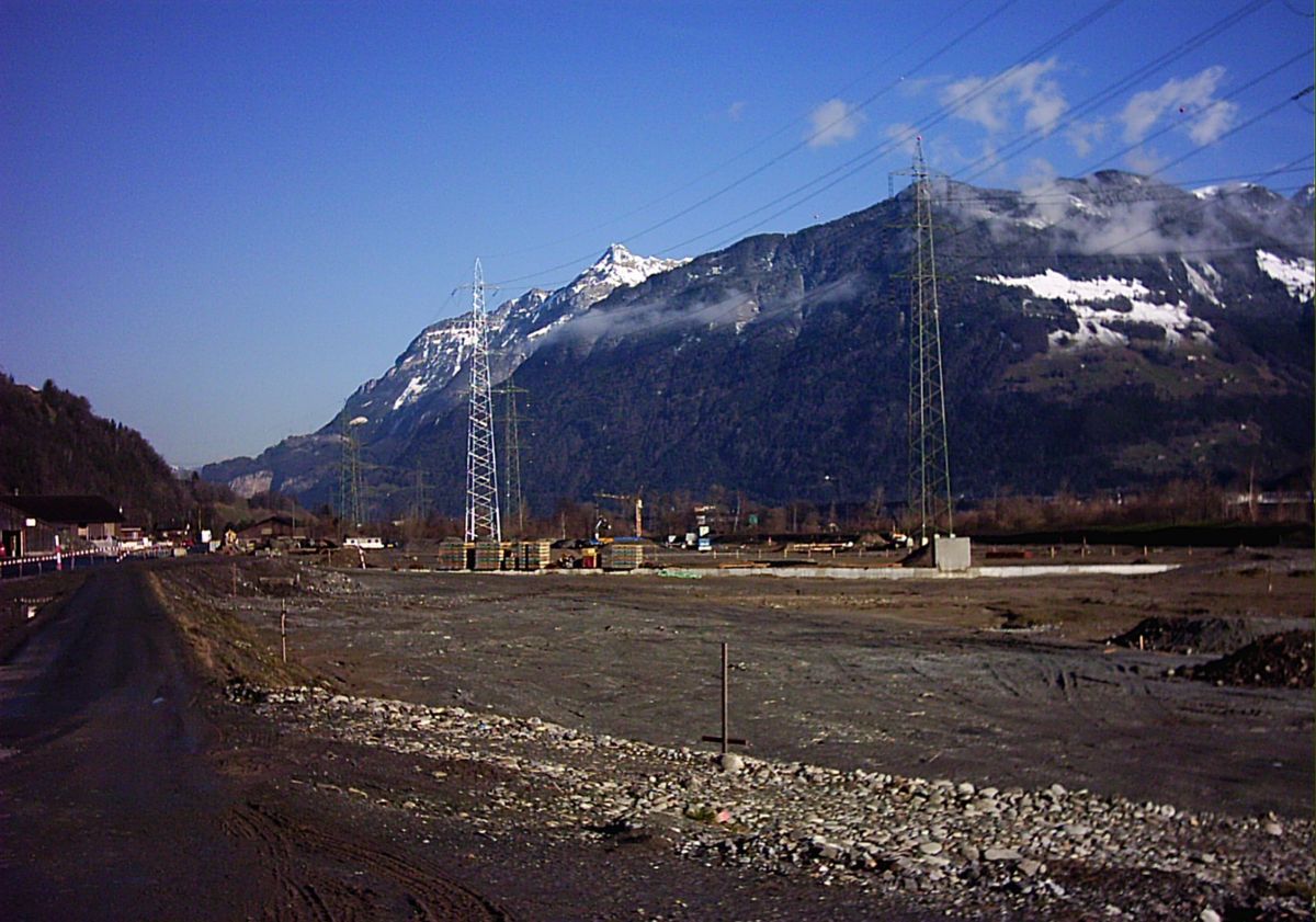 Nun wurde auch bereits Material für die Umlegung der Nebenstrasse ,von der benachbarten Neat Baustelle herangeführt. Auch zu dem Zeitpunkt sind schon die Tiefbauarbeiten ,wie Entwässerung ,kanalisierung eines Bergbaches, etc. in vollem Gange.