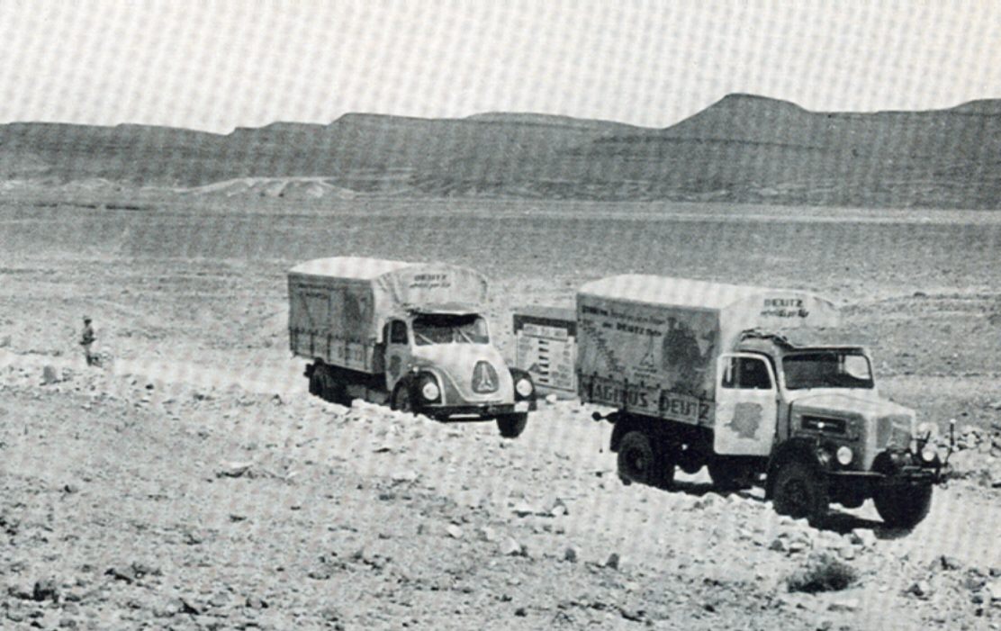 Herr Verreet lenkte den Allradwagen A 3500 und Herr Mölter von der Klöckner-Humboldt-Deutz A.G., Werk Ulm, fuhr den schweren S 6500. Auf den Planen der Fahrzeuge prangte in leuchtenden Farben die Reiseroute neben den weltbekannten Firmenzeichen der Klöckner-Humboldt-Deutz A.G.