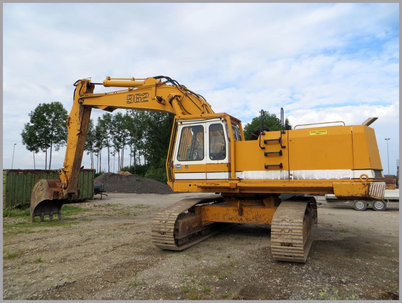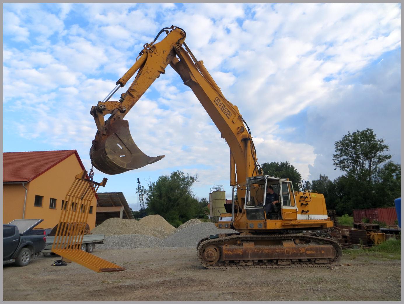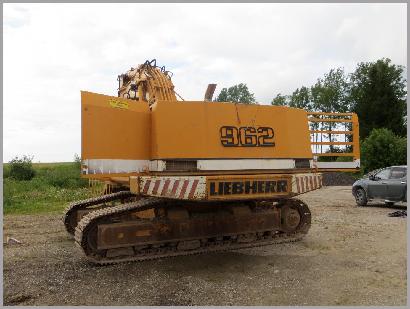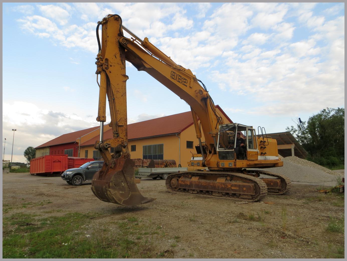 Es handelt sich um einen Liebherr R962 mit LC Laufwerk und recht schmalen Bodenplatten. Der Bagger wurde 1985 gebaut und lief bis jetzt ~7600 Stunden. Angetrieben wird der Bagger von einem 6-Zylinder Cummins Diesel mit 255Kw/347PS. Das Gewicht des Baggers wird irgendwo zwischen 55 und 60 Tonnen liegen.