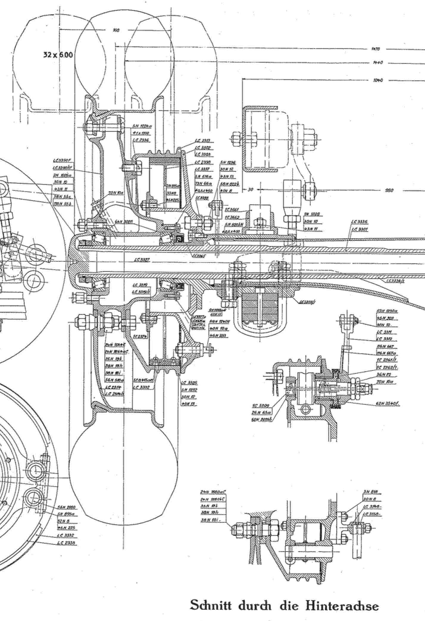 Die beiliegenden Seiten stammen aus einem Saurer-Ersatzteilkatalog LC1/LC2 von 1937 für Kleinlastwagen mit 0,8...2,3 Tonnen Nutzlast. Bei den Schnittzeichnungen sind sowohl das K- als auch das Scheibenrad gezeichnet.