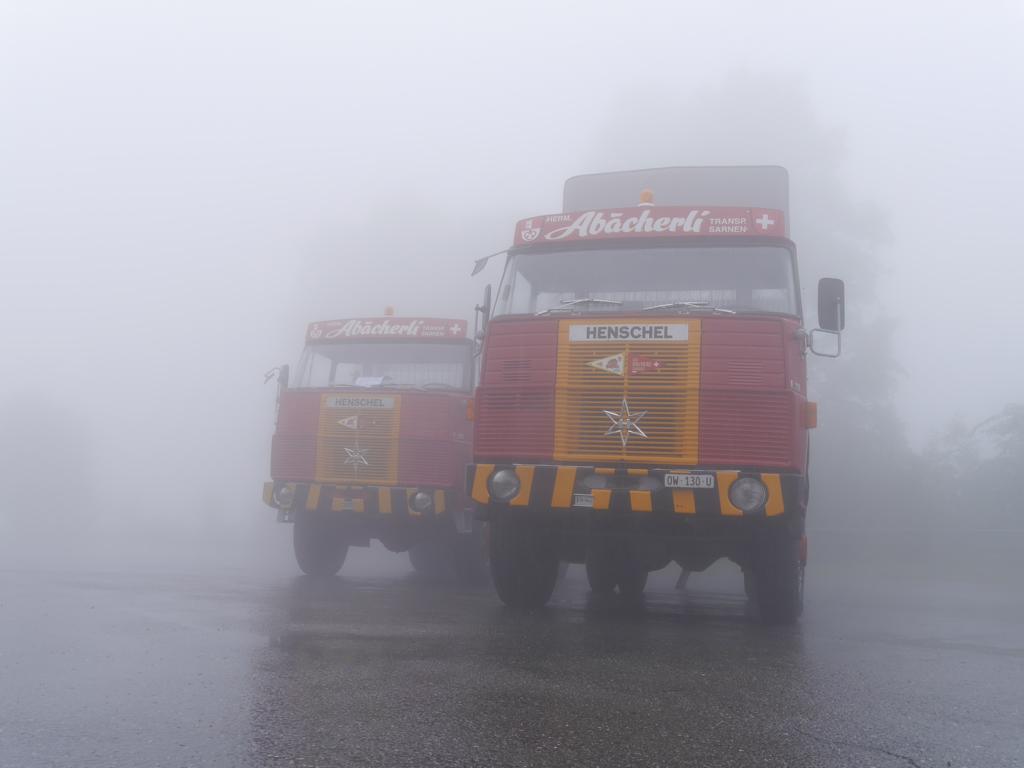 Das Wetter war so, wie es in den Bergen schon mal sein kann. Mal Sonnenschein, mal Regen oder tiefe Wolken......Wolken oder Nebel...auch was, was ein HENSCHEL durchaus reizvoll Aussehen lassen kann. Am Sonntag in der Frühe gelangen mir durchaus schöne Fotos, finde ich. Leider hatten schon einige Fahrzeuge die Heimreise angetreten, sonst hätte es mehr eindrucksvolle, in Dunst gehüllte HENSCHEL gegeben. Geht eben nicht alles. Das passende Wetter kann man nicht auf Wunsch bestellen....