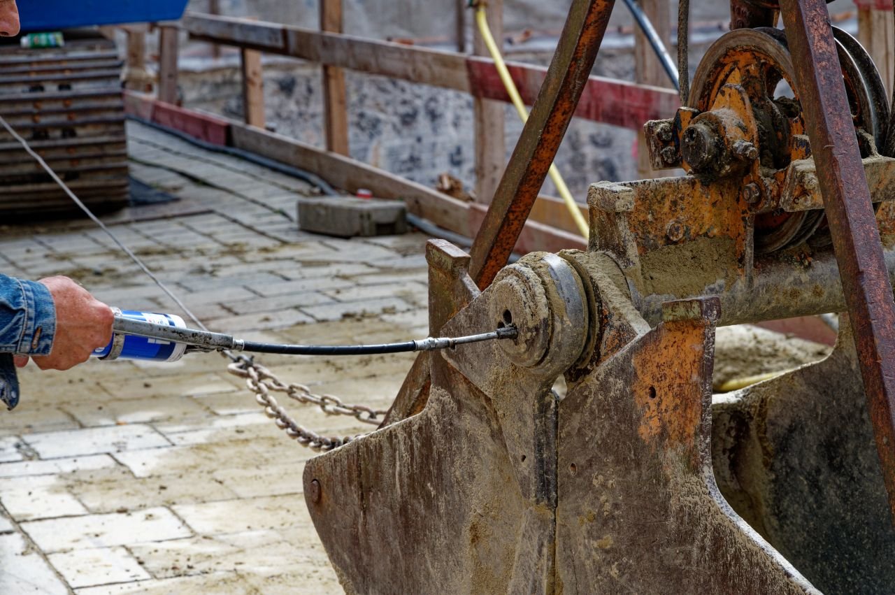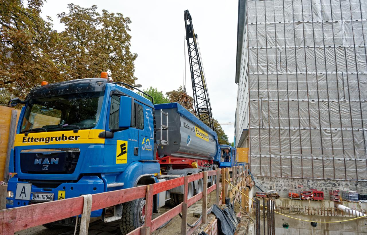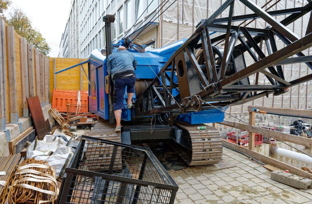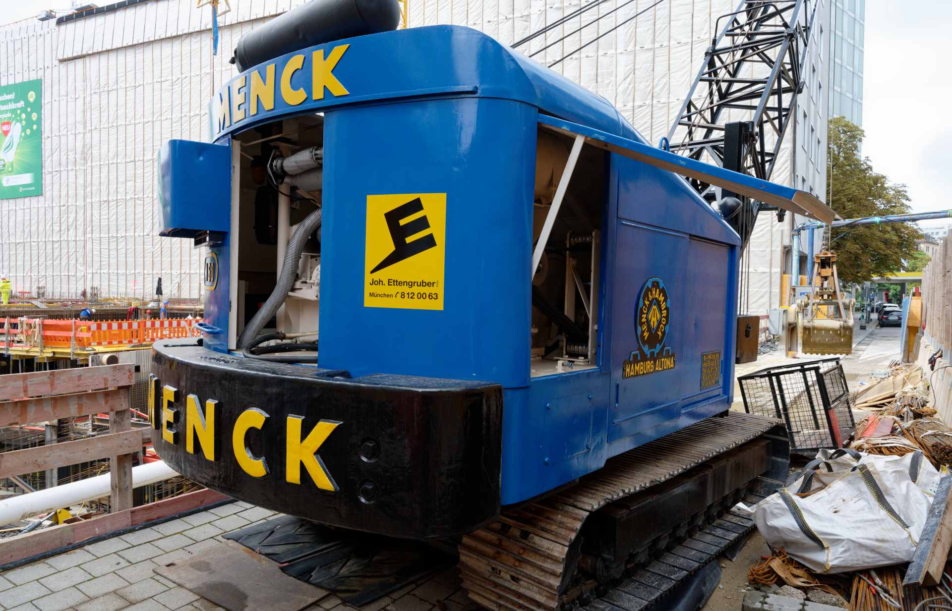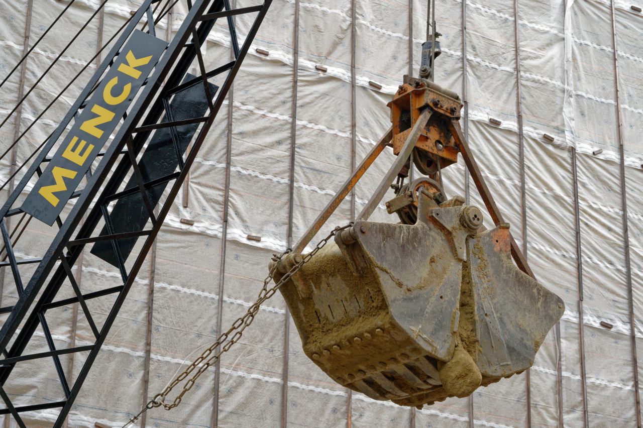 Tatsächlich ist es im Wesentllichen dem geringen Platz geschuldet, dass hier ein M60 zum Einsatz kam. Ein Hydraulikbagger kam für diese Arbeit nicht in Frage, weil er ausgestattet mit einer Greiferverlängerung zwar sicher die maximale Aushubtiefe von ca. 9,5m erreicht hätte, er wäre aber nicht über die Steifen im unteren Bereich der Baugrube hinweg gekommen.
