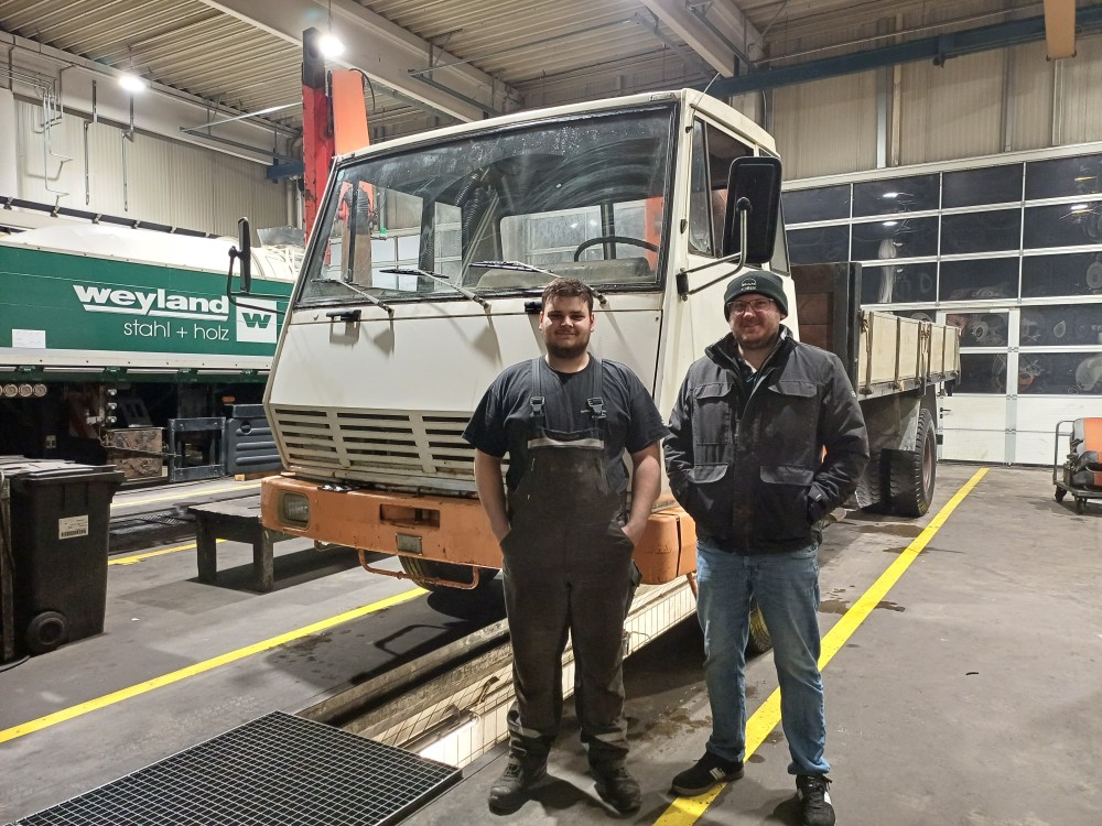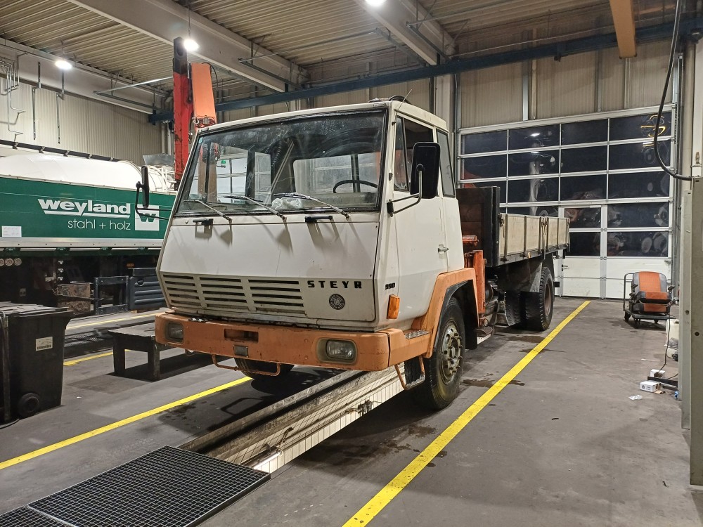 Das Fahrerhaus wird eher in Richtung Komplettrestauration gehen, da fehlt es himmelweit. Dann auch gleich komplett lackiert (Marke Eigenbau) da der Lack an sehr vielen Stellen schadhaft ist und heruntergekommen aussieht. Windschutzscheibe ist kaputt, habe ich zum Glück noch. Grobe durchrostungen an mehreren Stellen, vor allem Beifahrerseitig. Auspuff ist auch durch. Reifen sind derart rissig, da wird sogar der Bremsenprüfstand riskant, müssen alle neu. Innenraum teilweise stark verschlissen, Fahrersitz ist durch und muss von Grund auf neu gemacht werden, Beifahrersitz könnte man noch retten. Grober Luftverlust, aber gut, sonst wär's kein Steyr