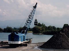 Dieser Bagger wurde auf dem Rheindamm zur entladung von Kiesschiffen verwendet, heute arbeitet er meines wissens bei der Fa. Luff wo er mit Abbruchkugel zum Betonzerkleinern genutzt wird...