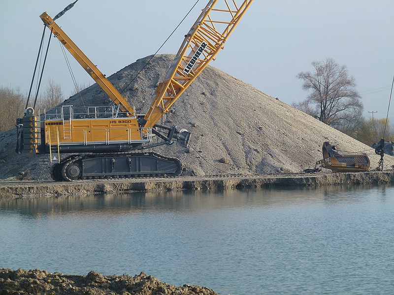 Reine Vermutung vom Schlorg: Sicherlich ist es auch dem Testbetrieb geschuldet, dass der Bagger etwas weiter vom Wasser wegsteht. Die Fa. Liebherr wird da des ein oder andere Wort mitreden und dafür sorgen, dass der Bagger nicht so nah am Wasser steht, dass der Kies unter den Ketten nachbricht.