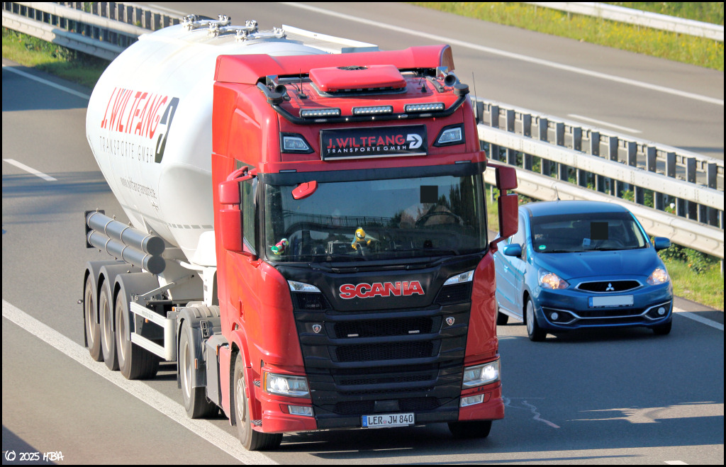 Scania mit Silo der Spedition Wiltfang auf der A31.