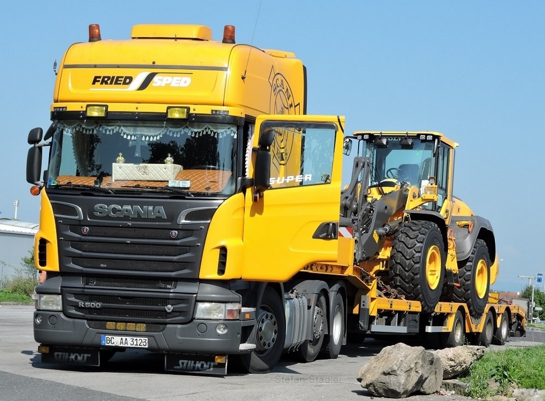 Friedsped fährt auch für andere Kunden, ist aber tatsächlich die Haus- und Hofspedition von Liebherr. Das Tochter- (Schwester-?) unternehmen OST fährt zum Beispiel häufig Waggons auf Straßenrollern für Liebherr Hausgeräte in Ochsenhausen.