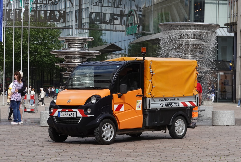 Vermutung: Pritsche fuer den Behaelterdienst (Aufstellung/Tausch/Einsammlung) von Glas- oder Papierbehaeltern. Wenn das Fahrzeug diese sowieso schon leert, dann kann man den rest auch damit erledigen.