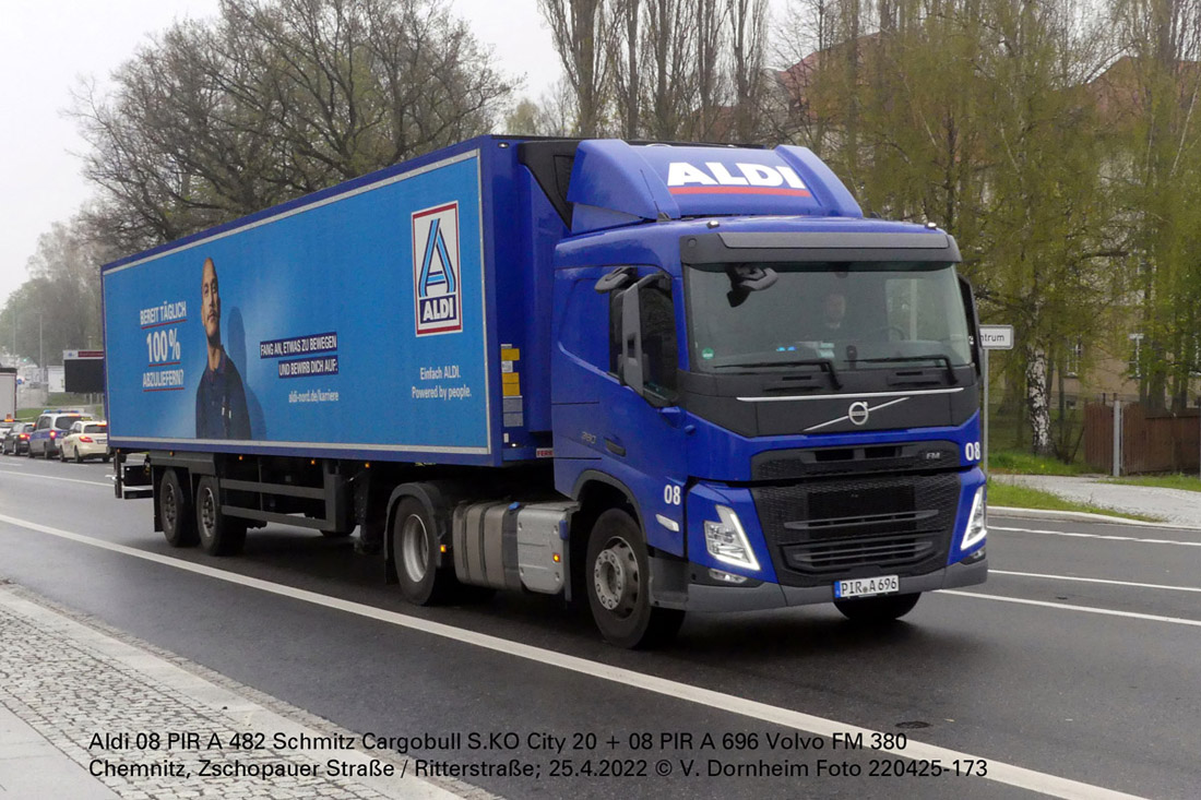 Aldi 08 PIR A 696 Volvo FM 380 + 08 PIR A 482 Schmitz Cargobull S.KO City 20 am 25.4.2022 auf der Zschopauer Straße in Chemnitz.