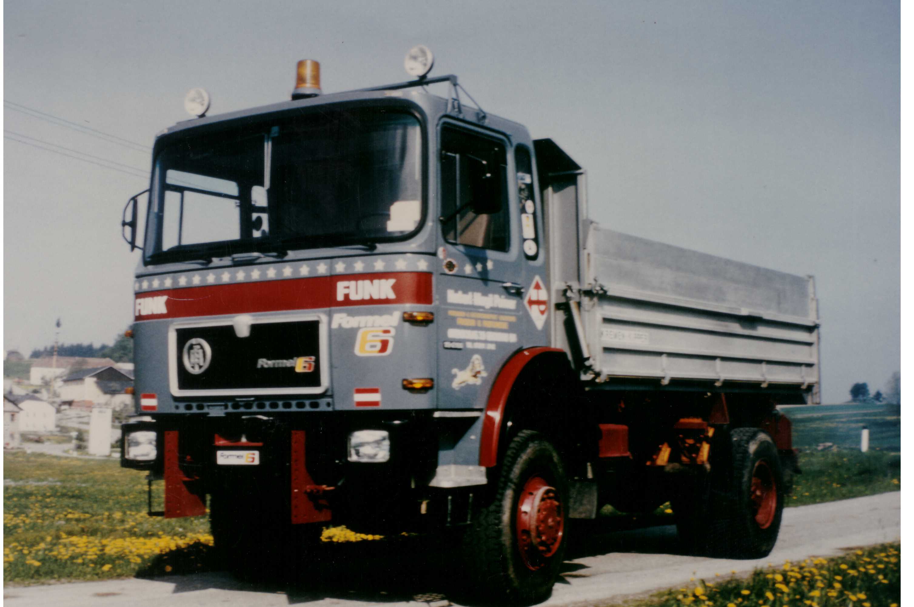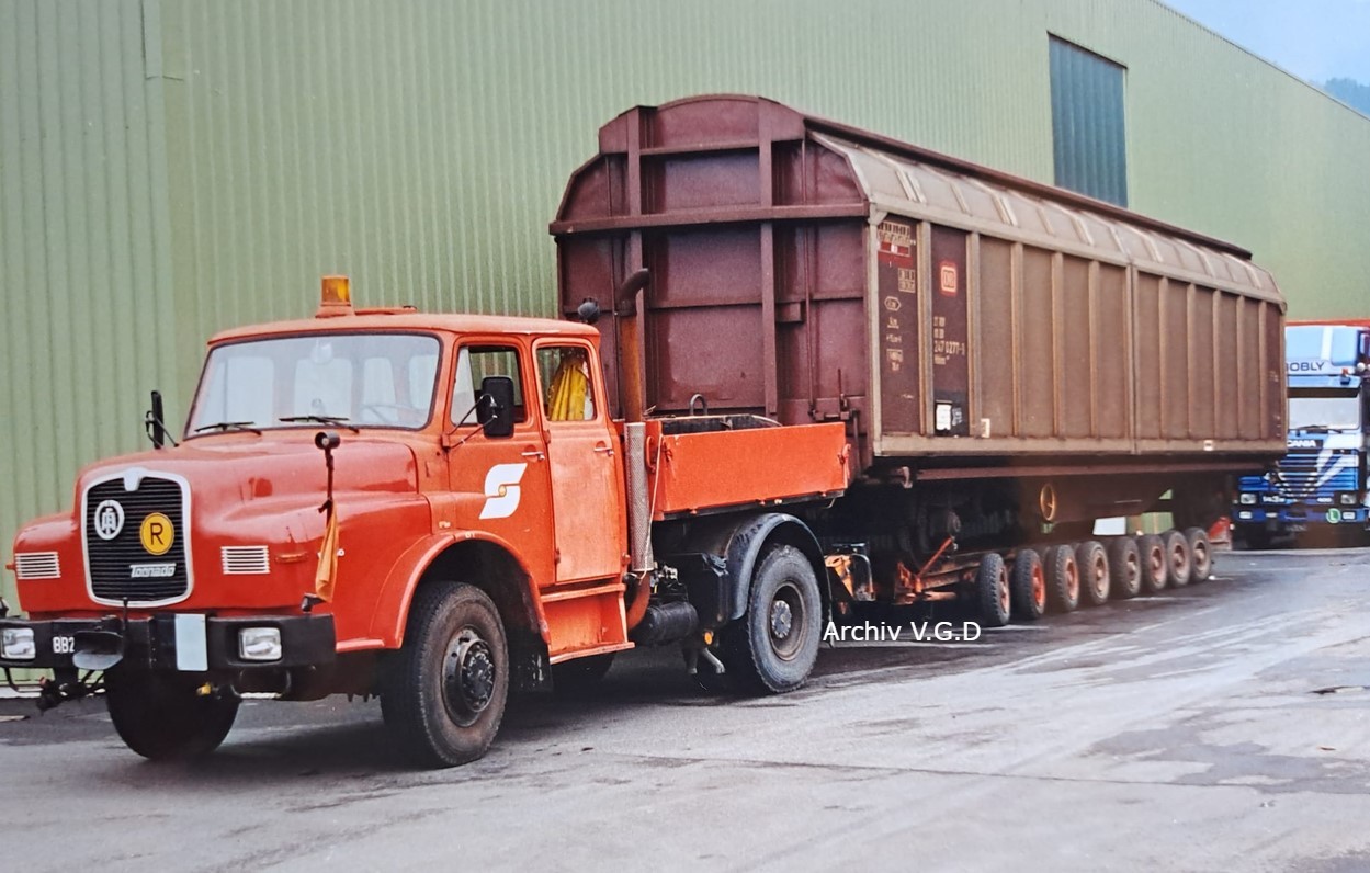 Im Vordergrund passiert gerade ein ÖAF Tornado 9-200 eines Tiroler Frächter die Szenerie.