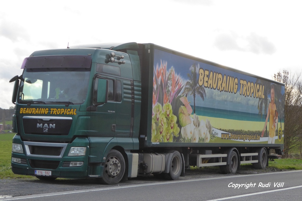 im Belgischen Beauraing - nahe der Französischen Grenze - konnte ich im Dezember 2023 diesen TGX18540 XXL Koffersattelzug von Beauraing Tropical verewigen.