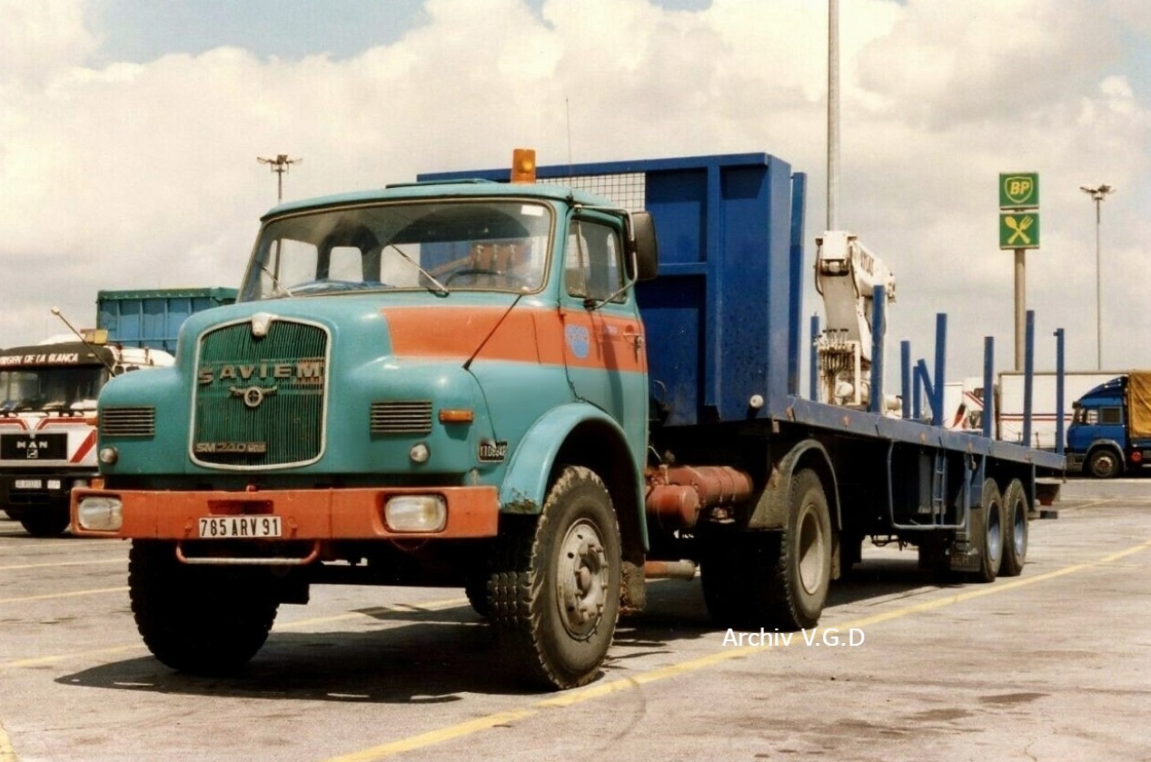Die dicke Stoßstange mit den höhergelegten Scheinwerfern war die Exportversion für außerhalb Europas. Der Hängerzug hat auch ein weißes Dach gegen starke Sonne. MAN hatte das aufgesetzte Tropendach, Saviem hat nur lackiert. |