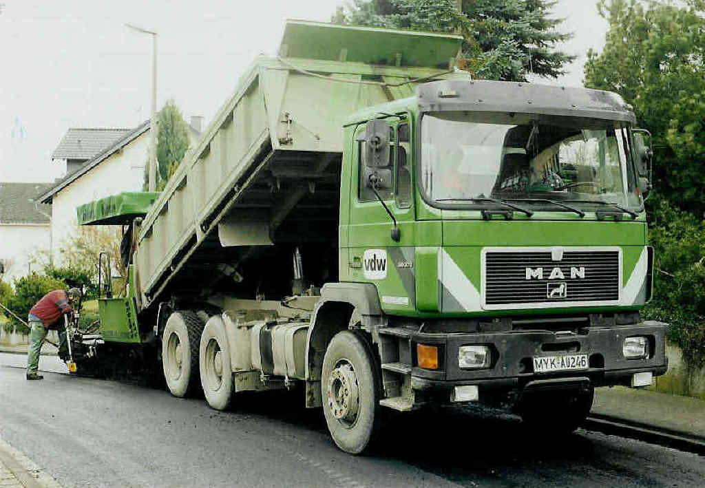 Ein MAN F 90, 26.372 DFK, der Fa. vdw (von der Wettern) beim Teerkippen in einen Ingersoll-Rand Teerfertiger.