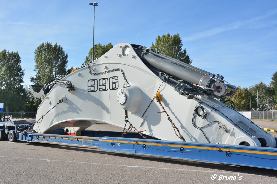 Geladen ist ein Monoblockausleger eines Liebherr R996B.