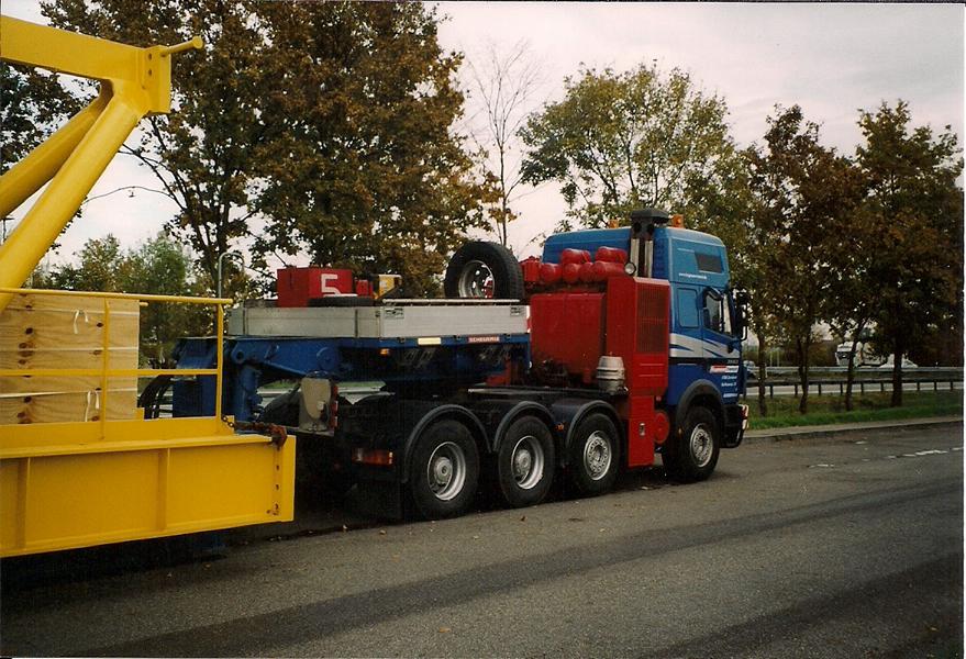 Vielleicht ist es ein Scheuerle Tieflader. Die klappbaren Auffahrrampen sind sehr markant.